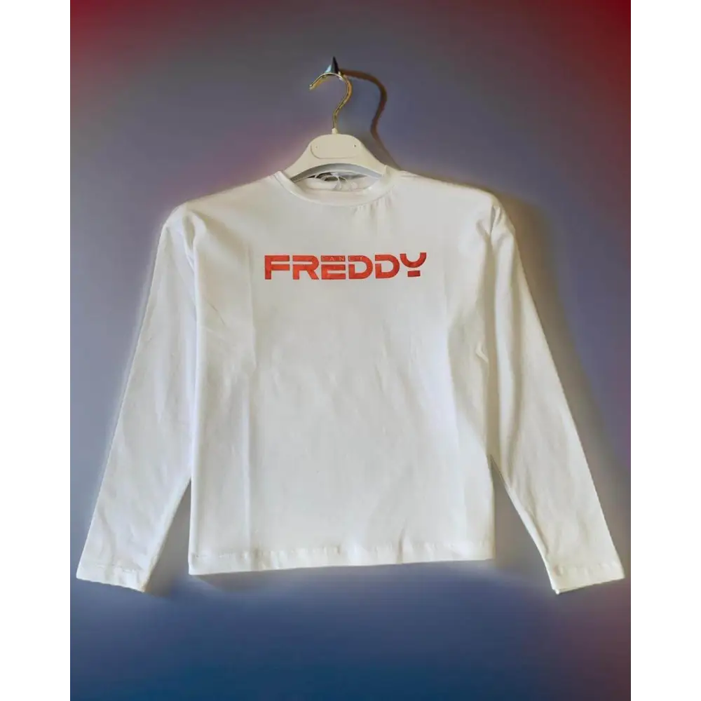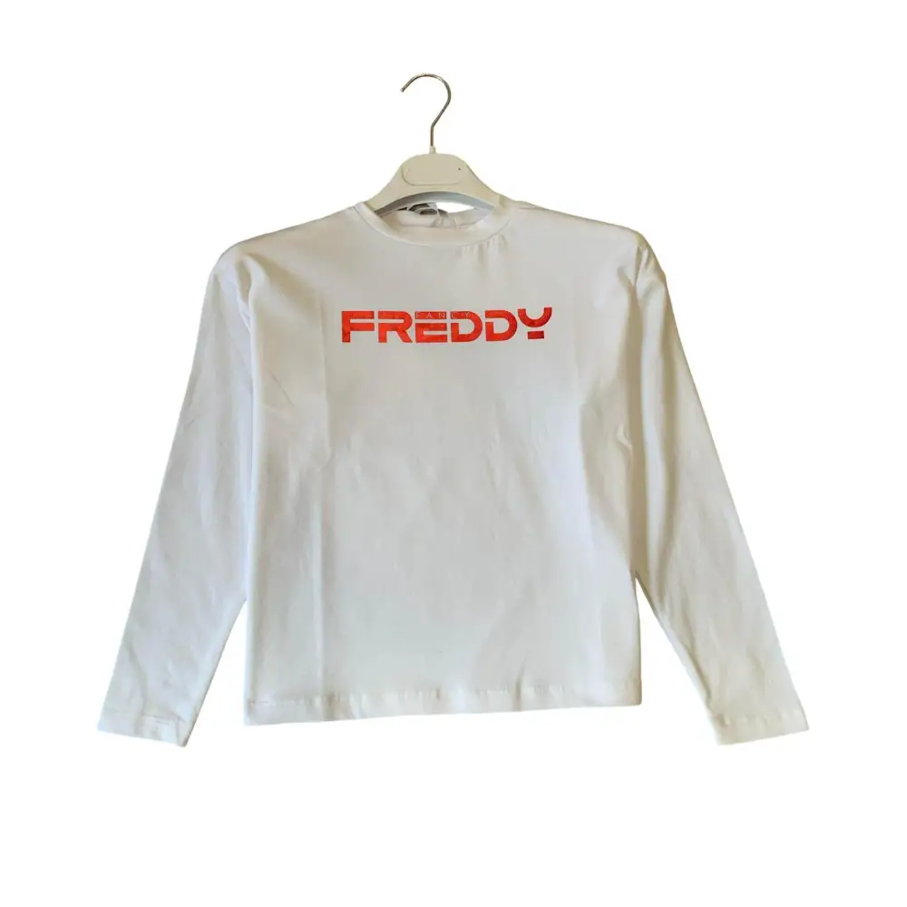 Questa comoda maglietta manica lunga bianca girocollo, firmata Freddy, è perfetta per le ragazze dagli 8 ai 16 anni. Il design semplice è arricchito dalla scritta “Freddy” con un logo rosso lucido che aggiunge un tocco di stile. Il modello largo garantisce libertà di movimento, ideale per l’abbigliamento bambini di tutti i giorni.