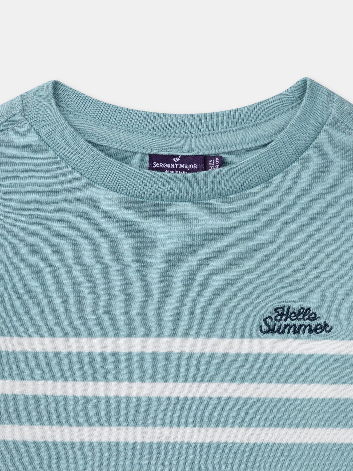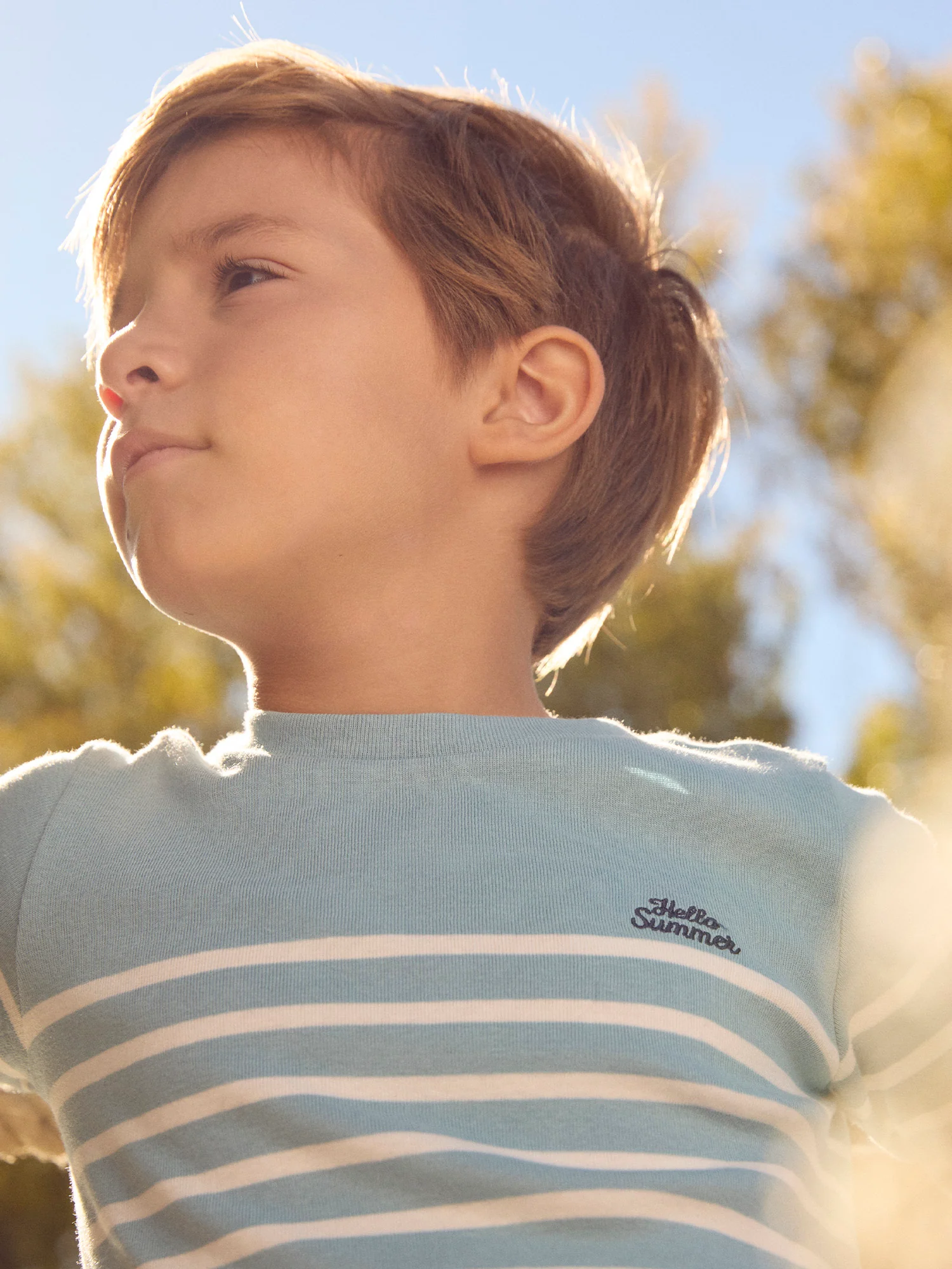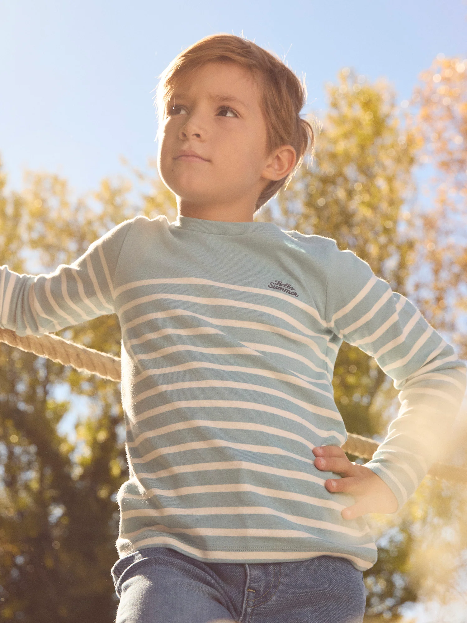 Per un bambino tranquillo e casual, perfetto per la primavera. Il tessuto a coste offre flessibilitร e comfort. Le righe e il ricamo sul petto danno un aspetto fresco.