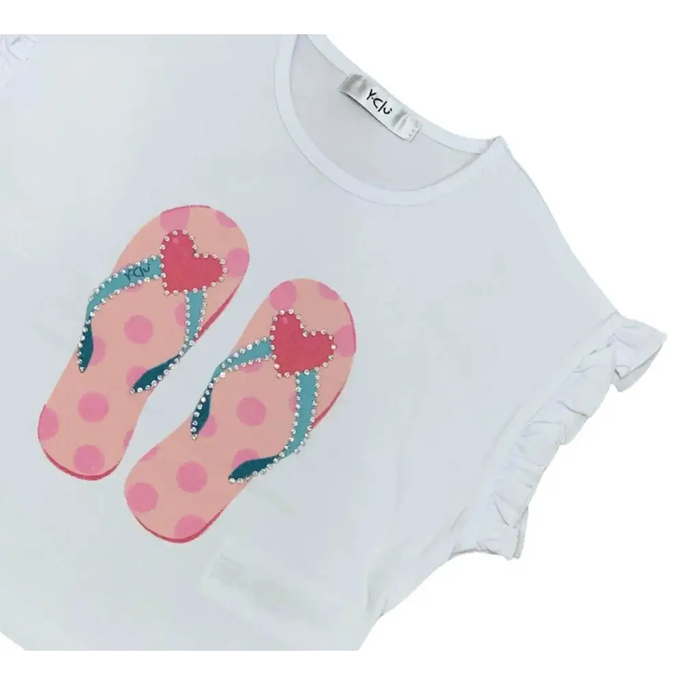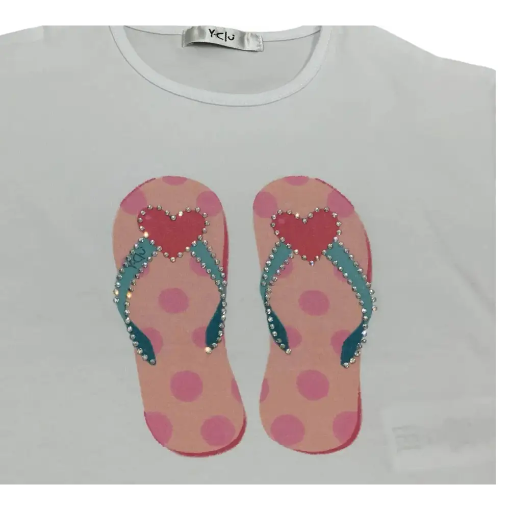 La MAGLIETTA CON STAMPA BAMBINA firmata Y-Clù è ideale per ogni occasione. Questo modello propone una simpatica stampa di ciabatte colorate su un tessuto bianco leggero.