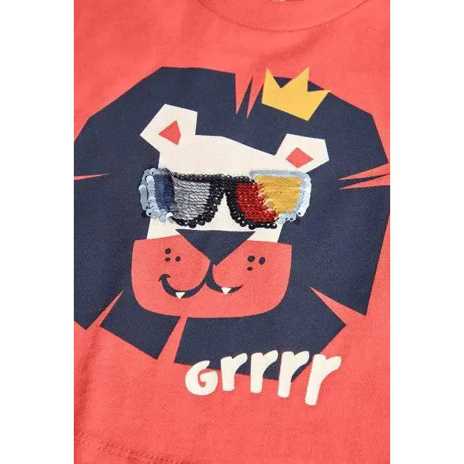 Questa vivace maglietta con stampa leone è perfetta per il tuo bambino. Il design divertente presenta un leone alla moda con occhiali paillettes girabili, che aggiungono un tocco di magia e interattività al suo look. Ideale per bambini dai 12 mesi agli 8 anni, questa maglietta manica corta Boboli è un capo d’abbigliamento bambini che combina stile e comfort.