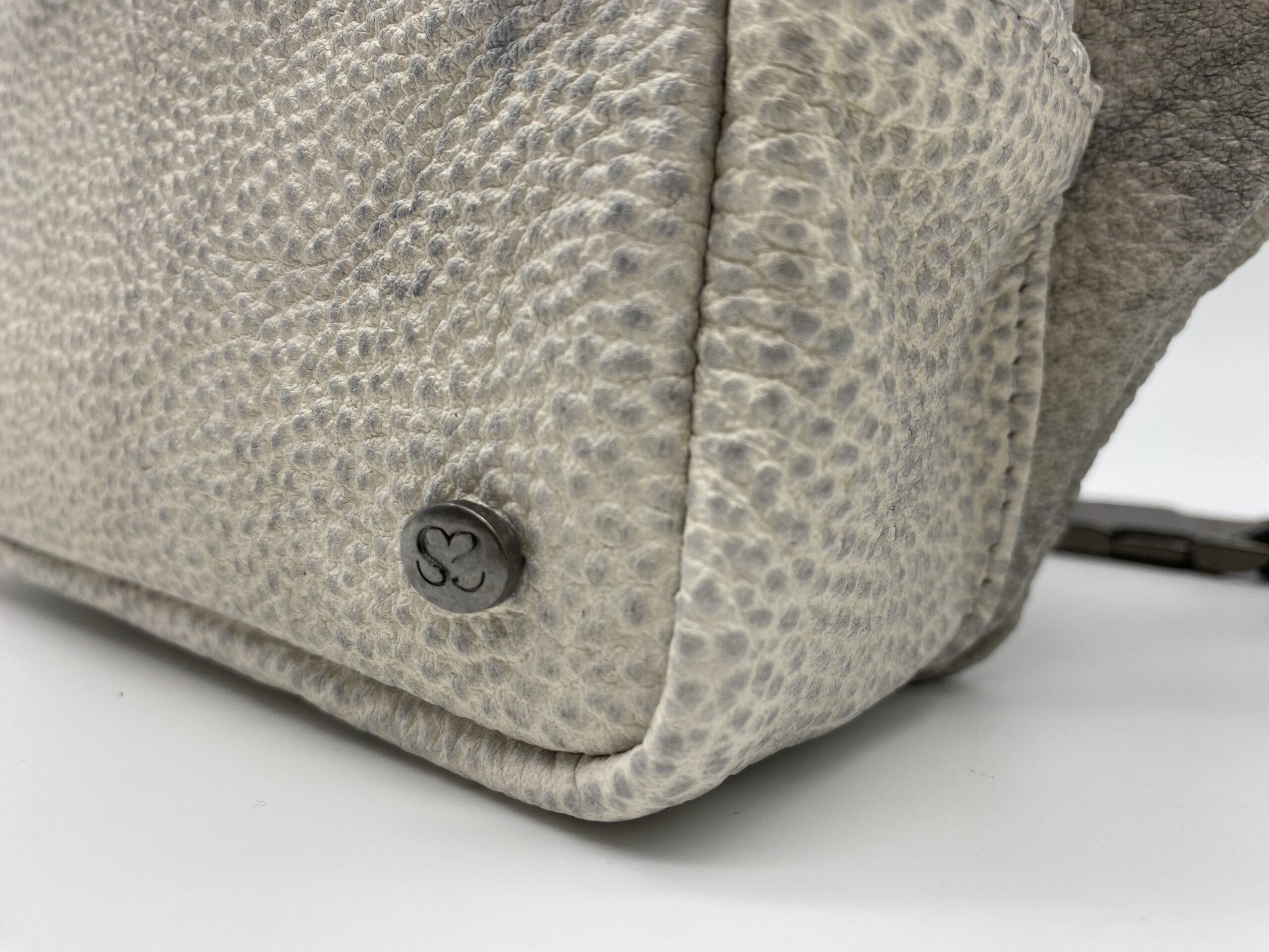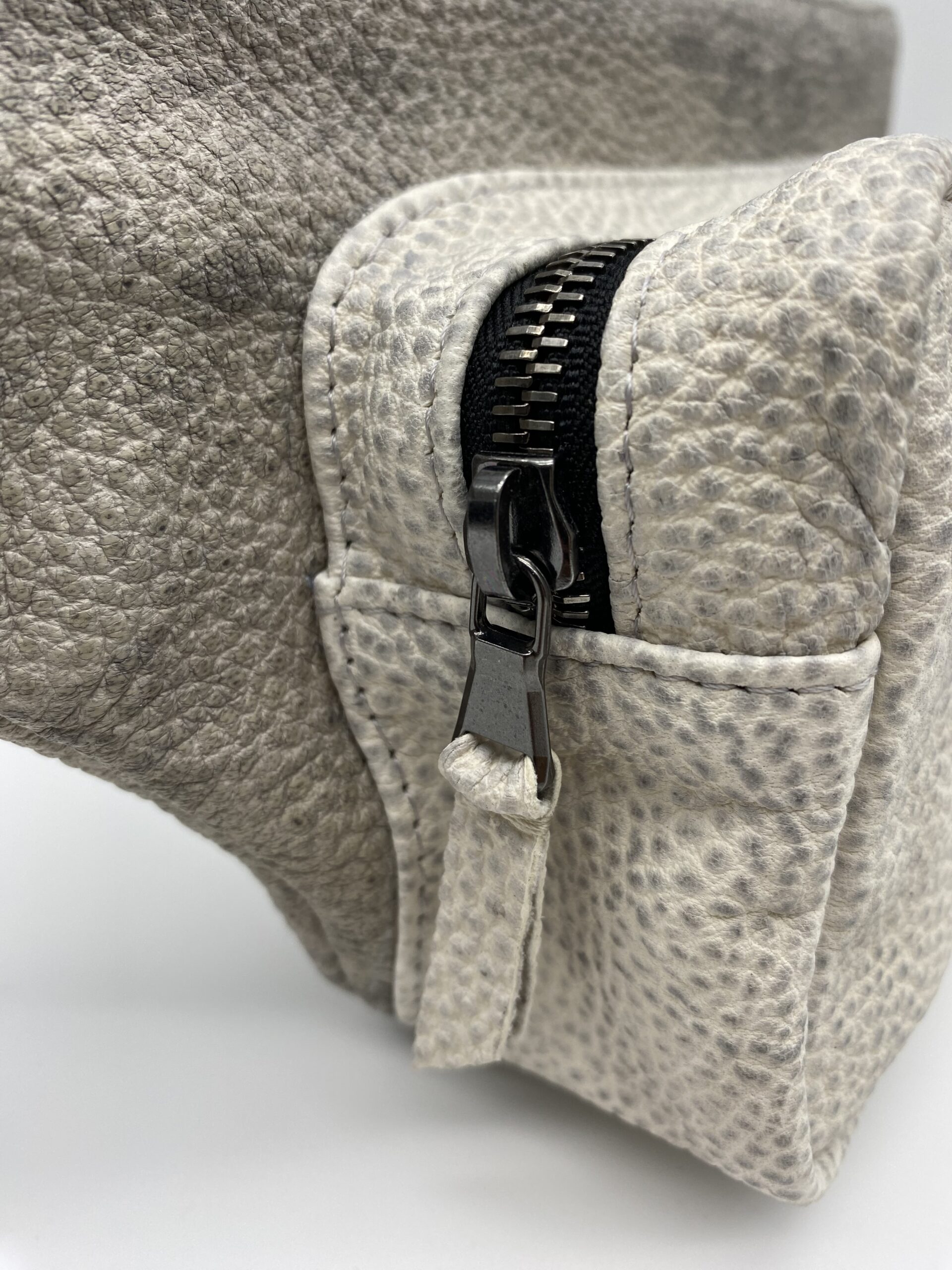 Realizzato in vera pelle stampa martellato con effetto invecchiato: la tasca davanti in colore bianco e la tasca dietro in colore grigio.