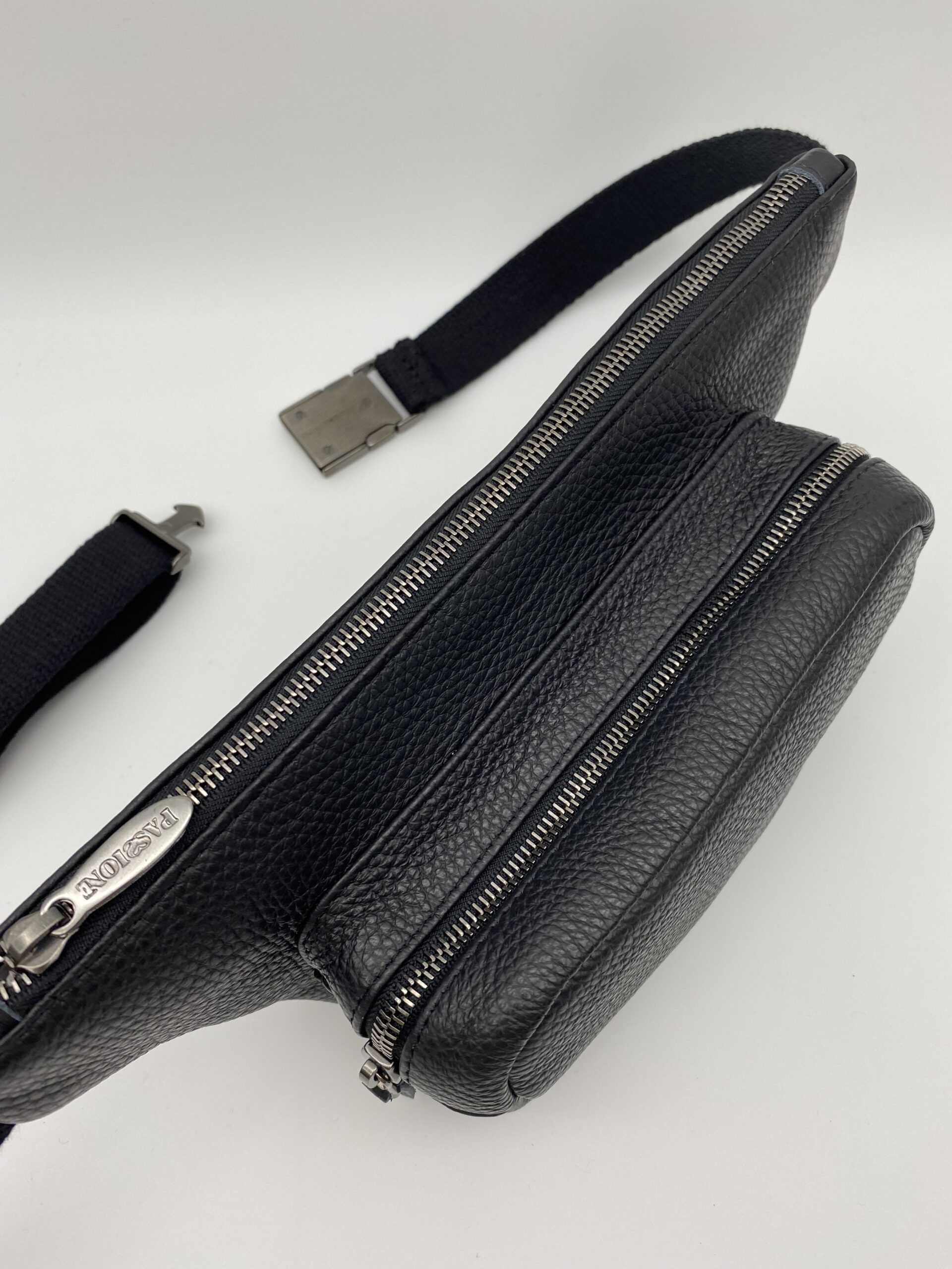 Il tiralampo della tasca piatta è in metallo canna fucile, logato Passione mentre quello della tasca davanti è realizzato in vera pelle.