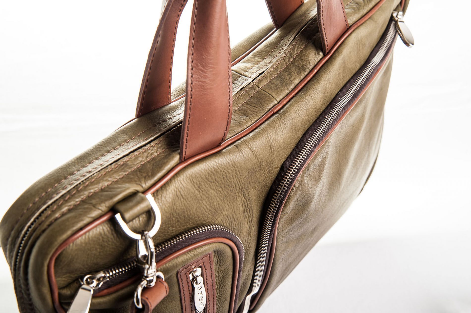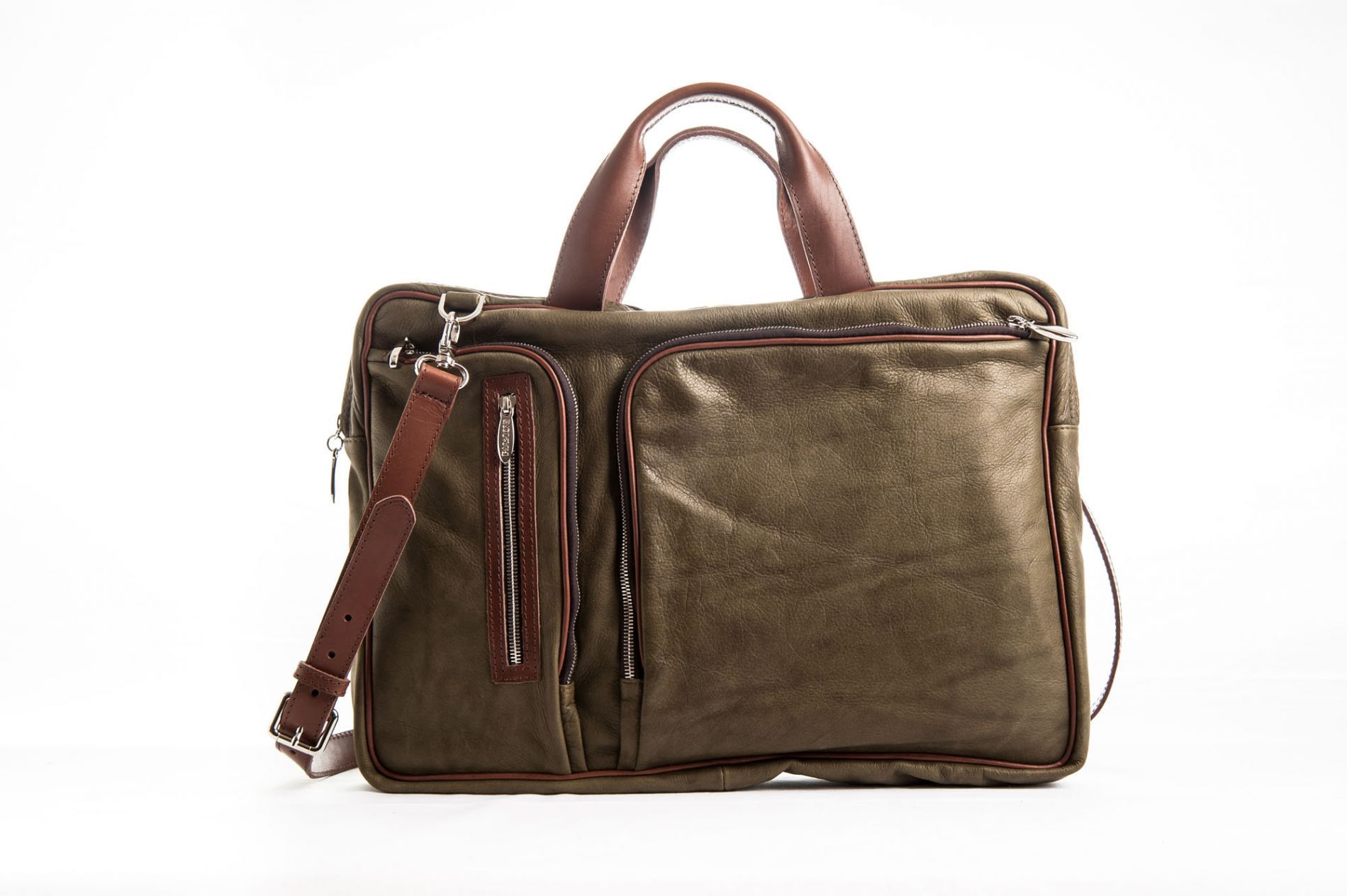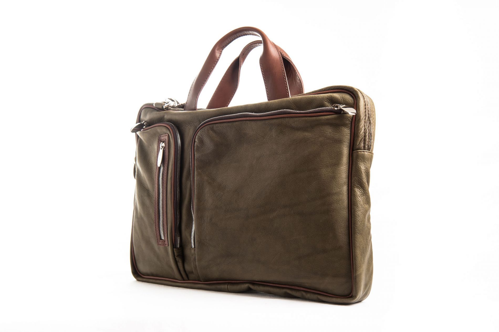 Borsa Portadocumenti in pelle color muschio, con doppio manico in cuoio marrone e tracolla regolabile.