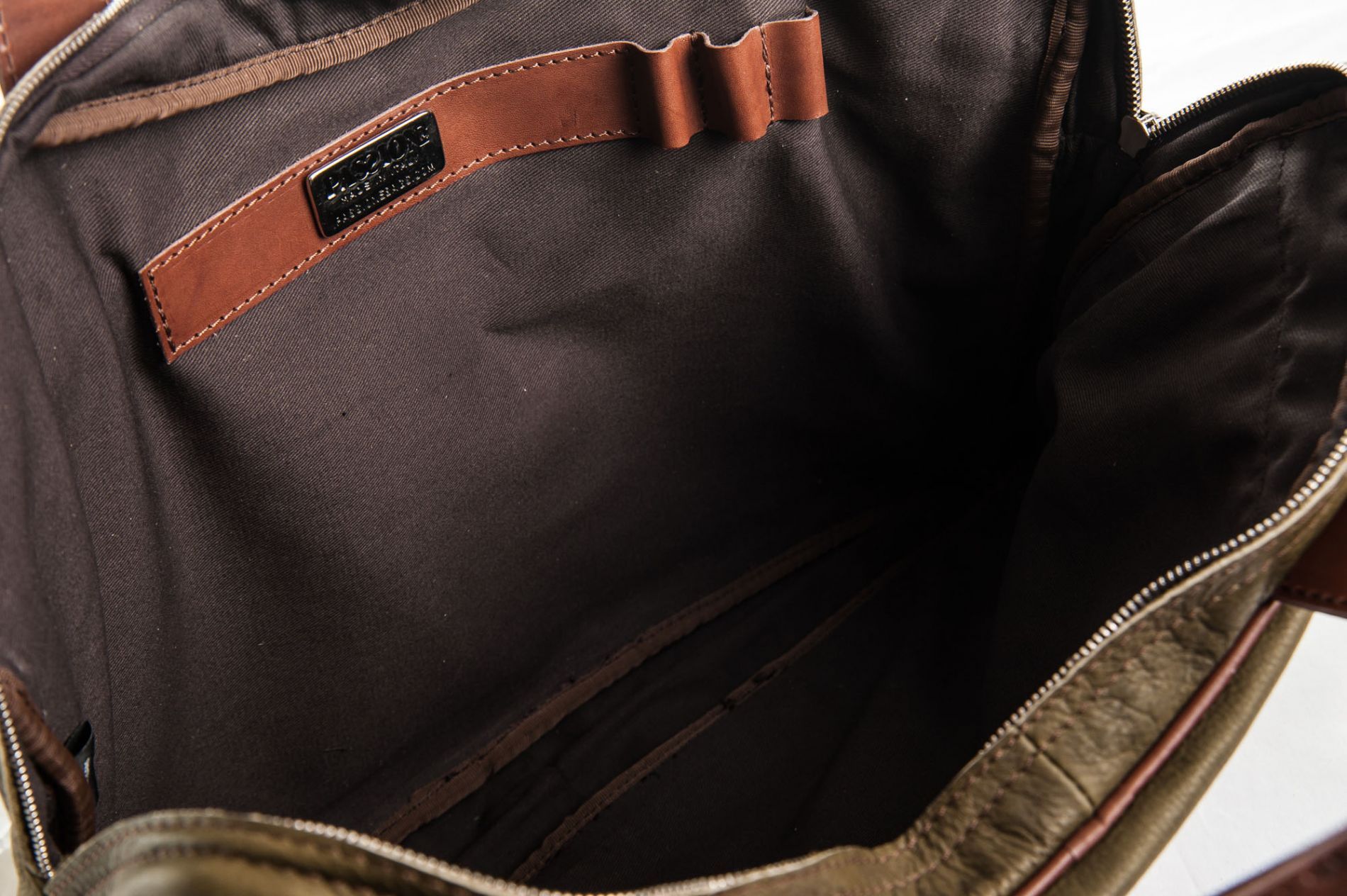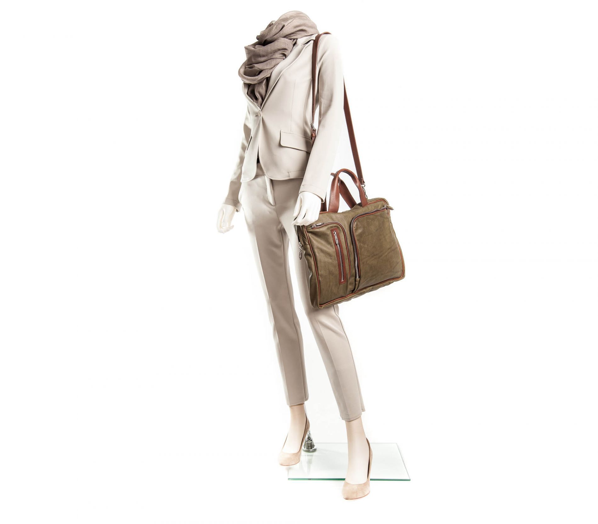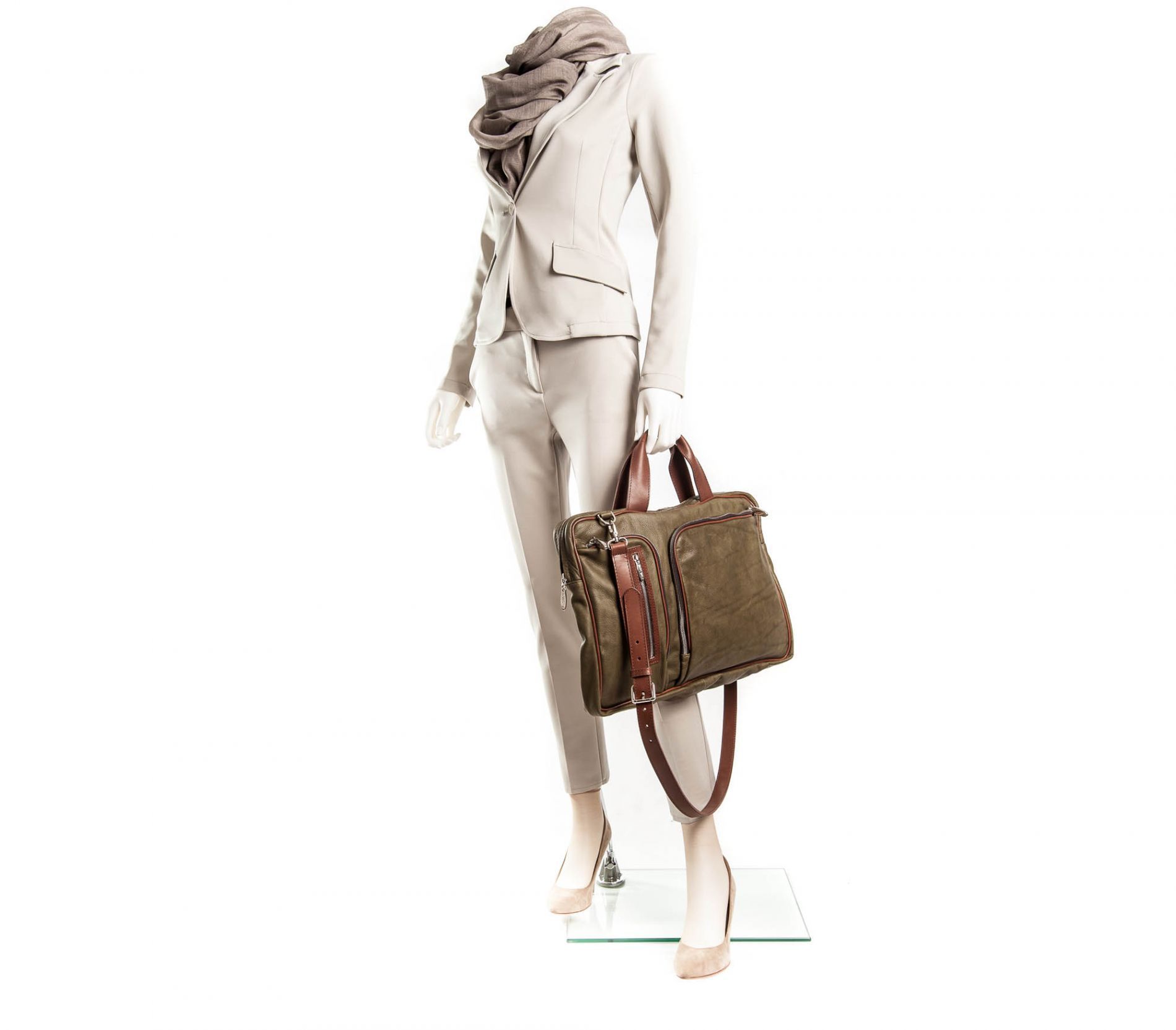 Borsa Portadocumenti in pelle color muschio, con doppio manico in cuoio marrone e tracolla regolabile.