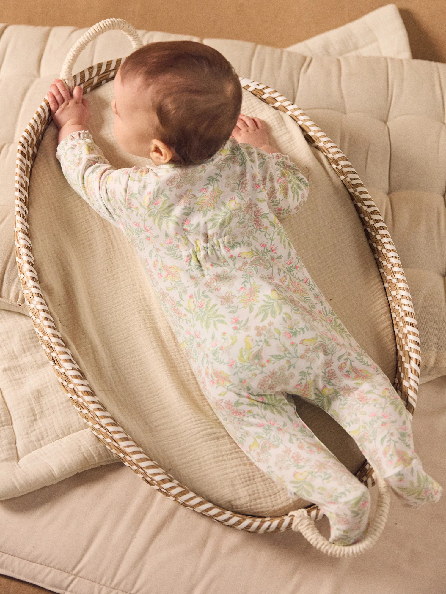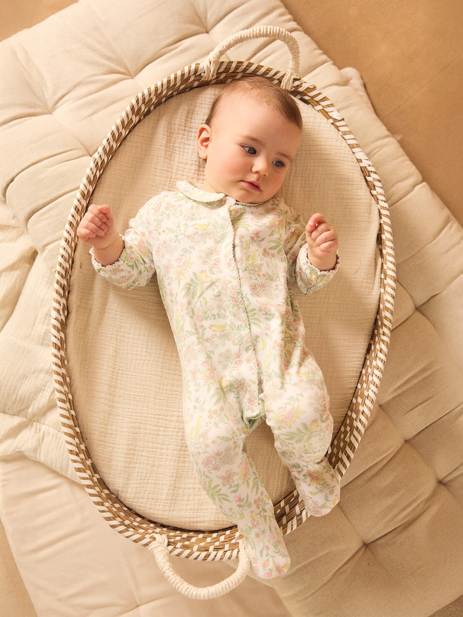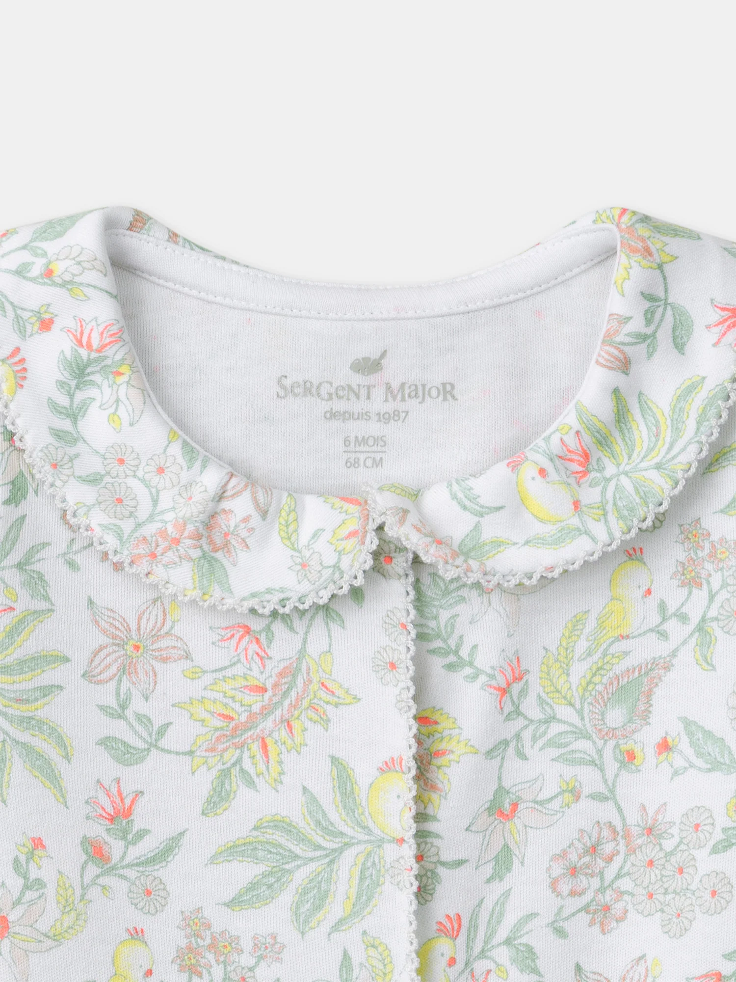 Progettato per un bambino calmo e osservatore, questo pigiama รจ perfetto per tutte le stagioni, di giorno e di notte. In interlock di cotone biologico, il suo taglio aderente garantisce comfort e libertร di movimento. La stampa di pappagalli e fiori e le rifiniture in picot conferiscono un tocco soffice e raffinato.