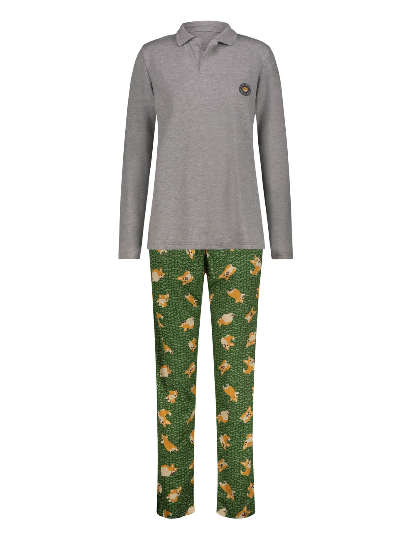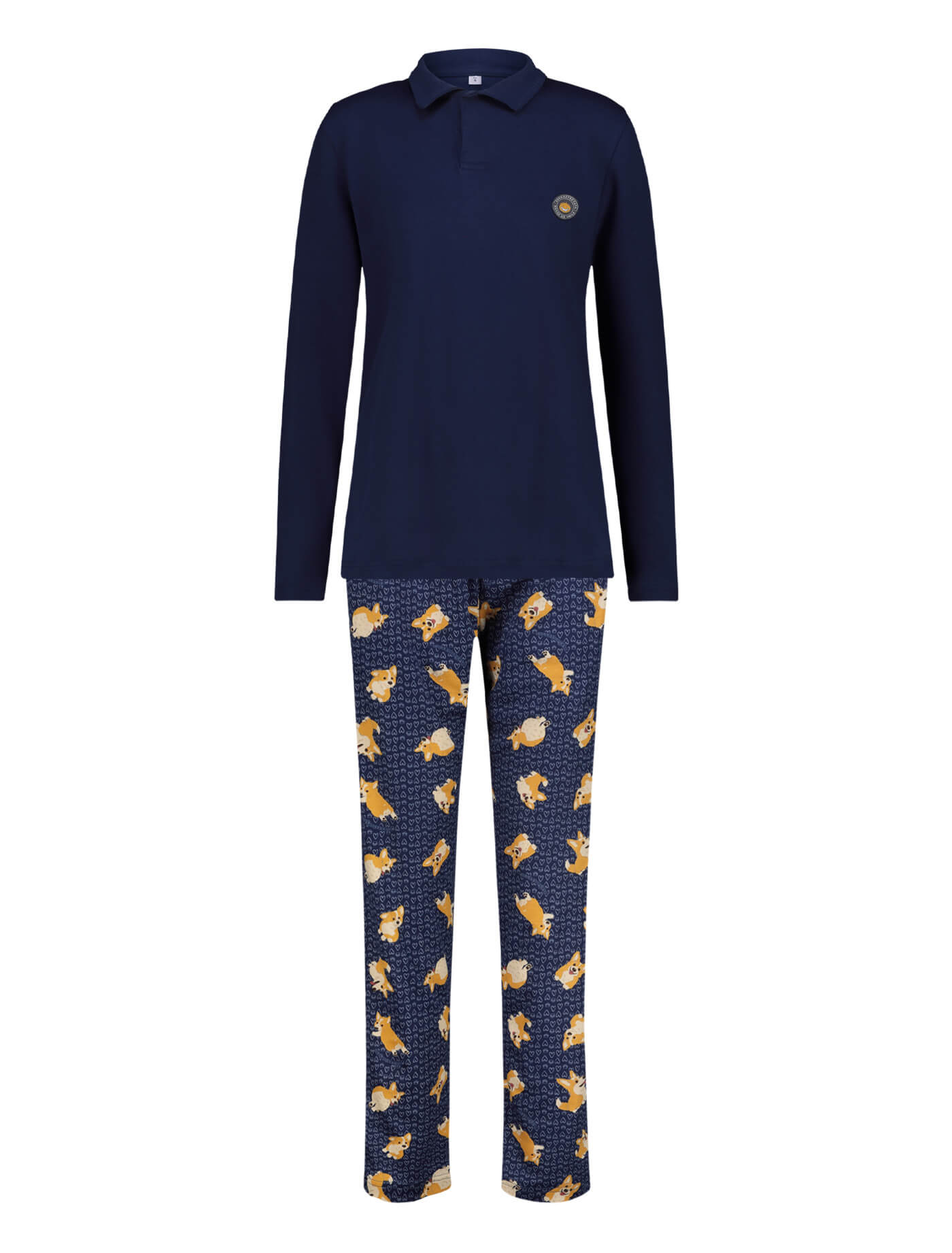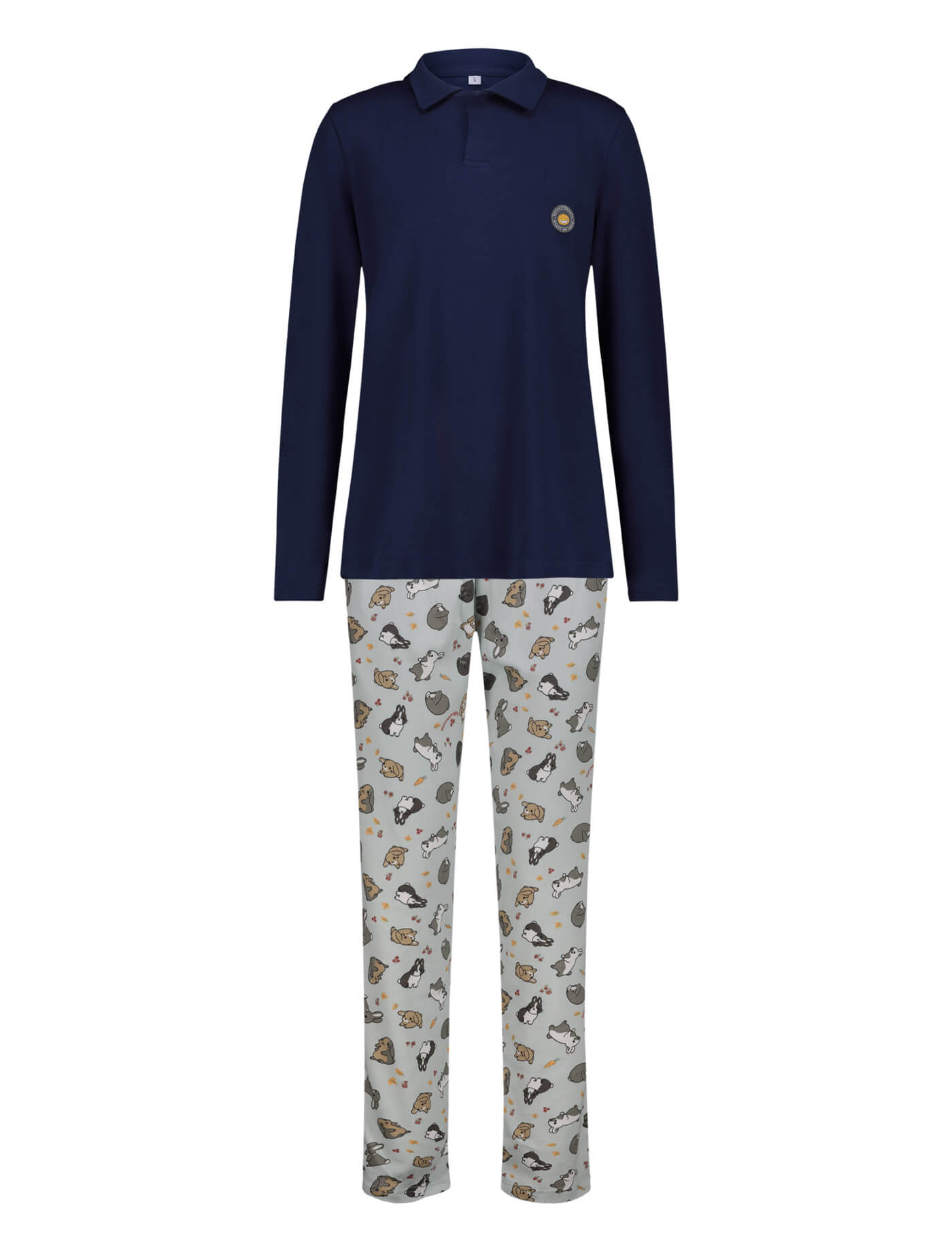 Pigiama uomo composto da maglia in tinta unita e pantalone con elastico e coulisse realizzato in divertenti fantasie in morbido interlock elasticizzato.