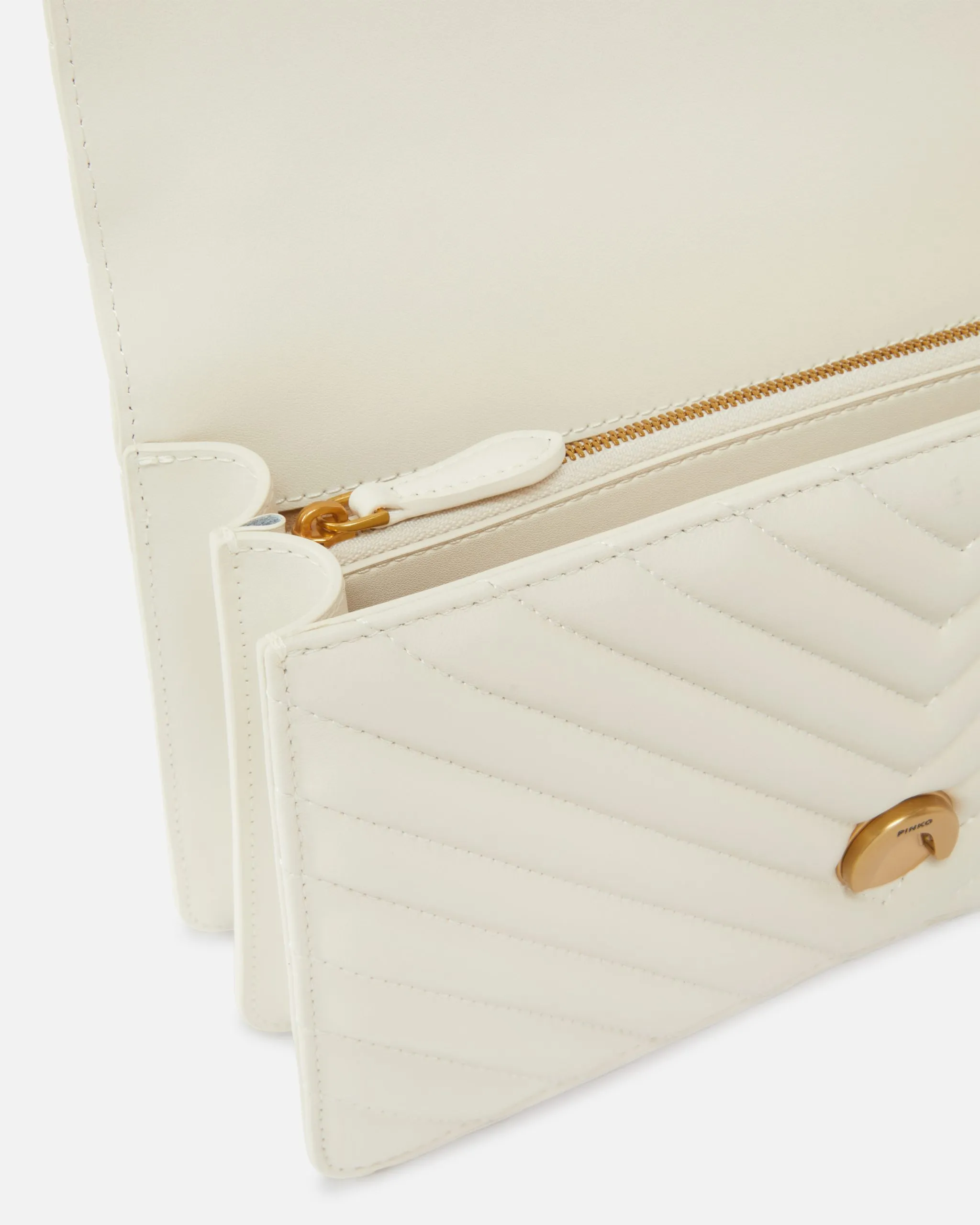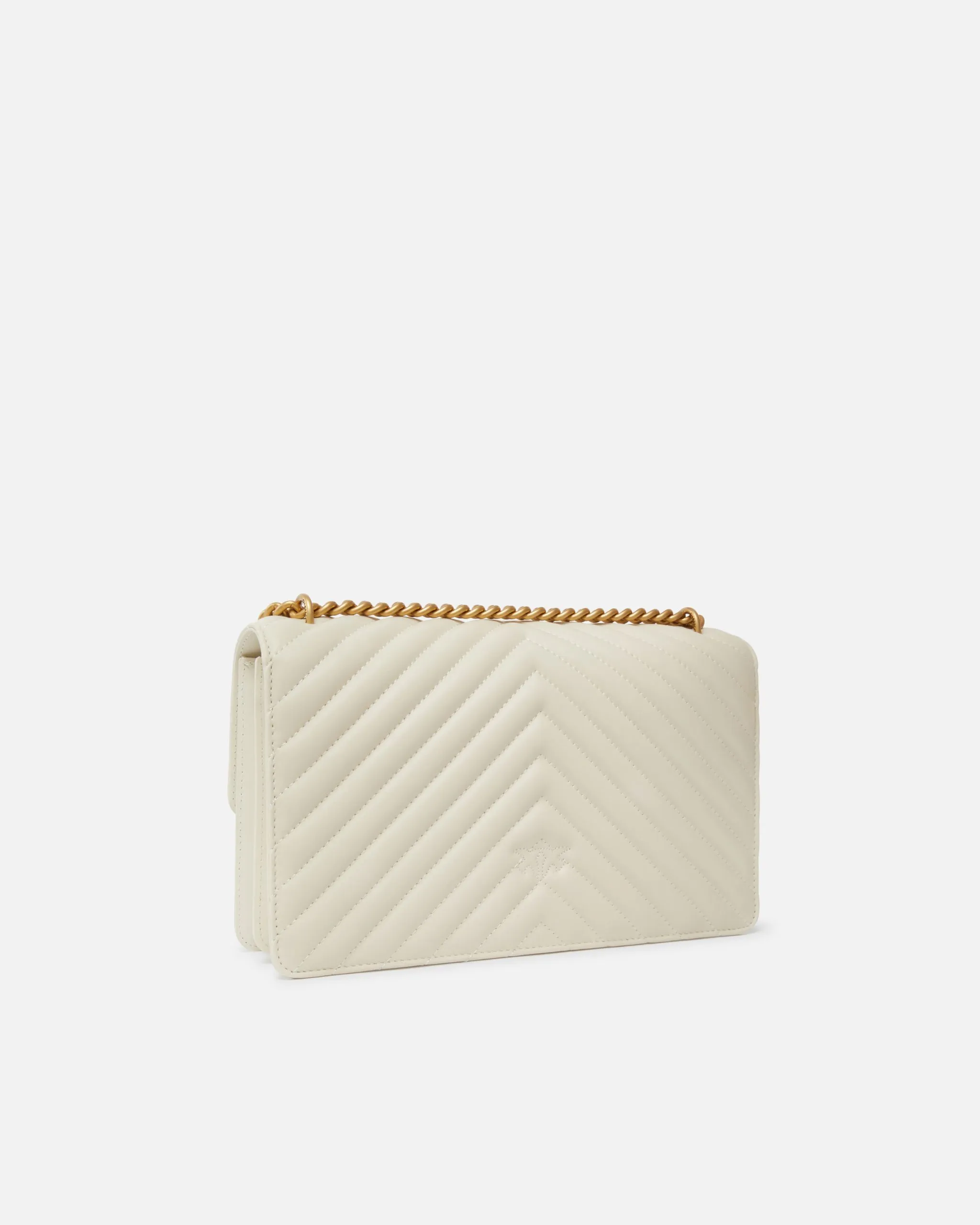 Classic Love Bag One in nappa trapuntata con motivo chevron. La chiusura è completata dall’iconica fibbia Love Birds Diamond Cut in metallo. L’interno è foderato in microfibra scamosciata e comprende tramezza chiusa con zip e tasca a parete in pelle. La tracolla combina la classica catena rotonda al pratico spallaccio in pelle regolabile.