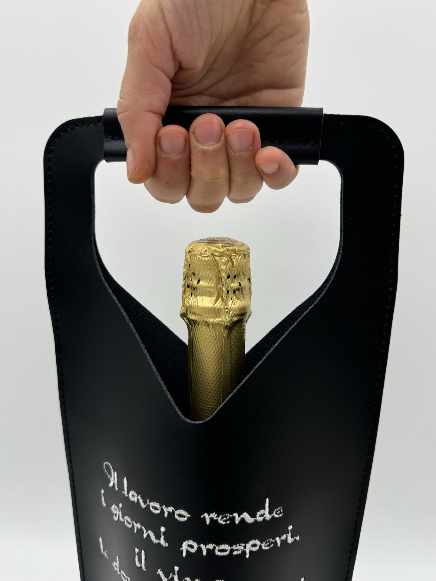 Un manico rinforzato per impugnare con comodità la borsa. Un materiale resistente come la pelle che può sostenere tranquillamente il peso di una bottiglia piena.