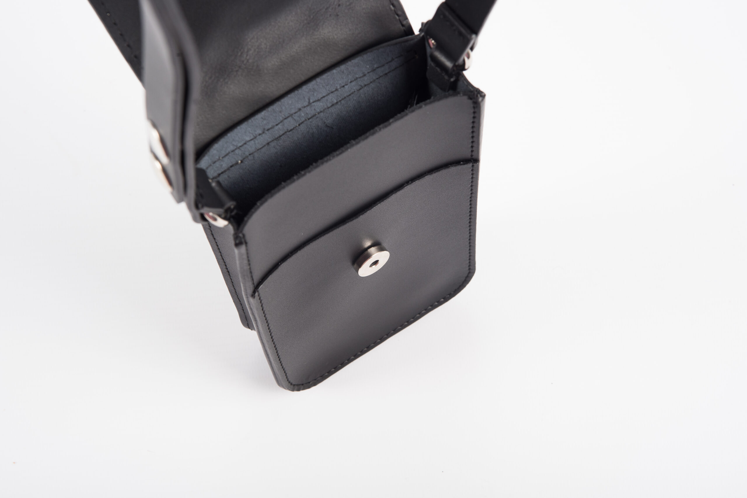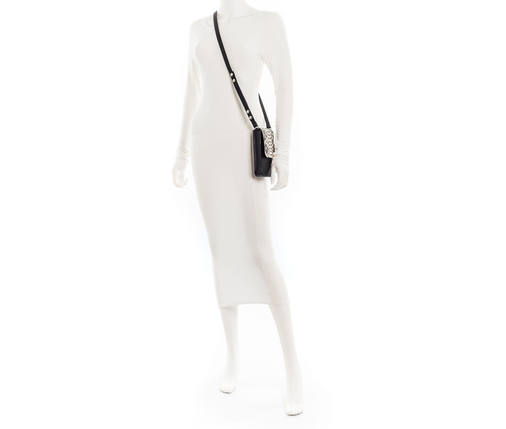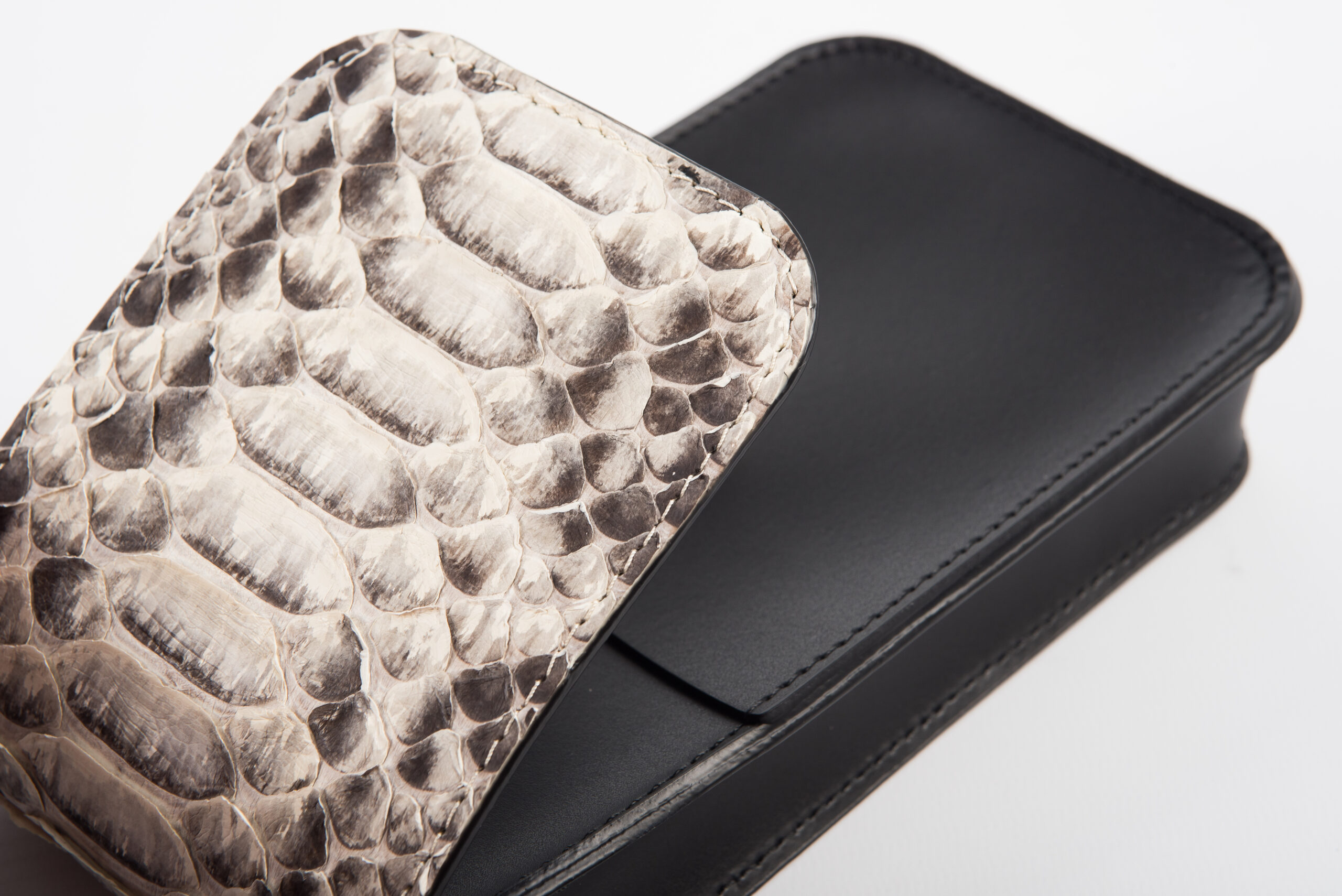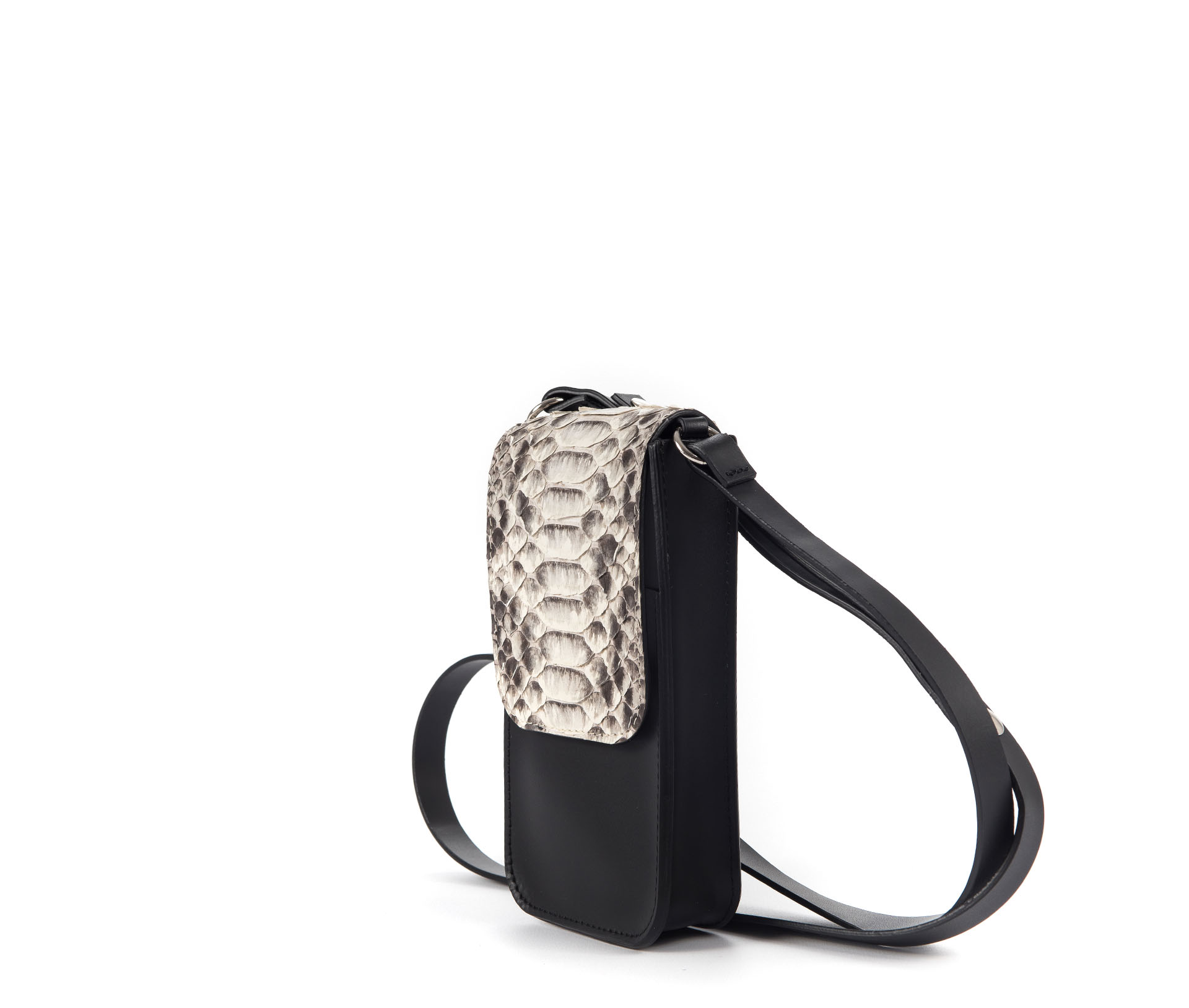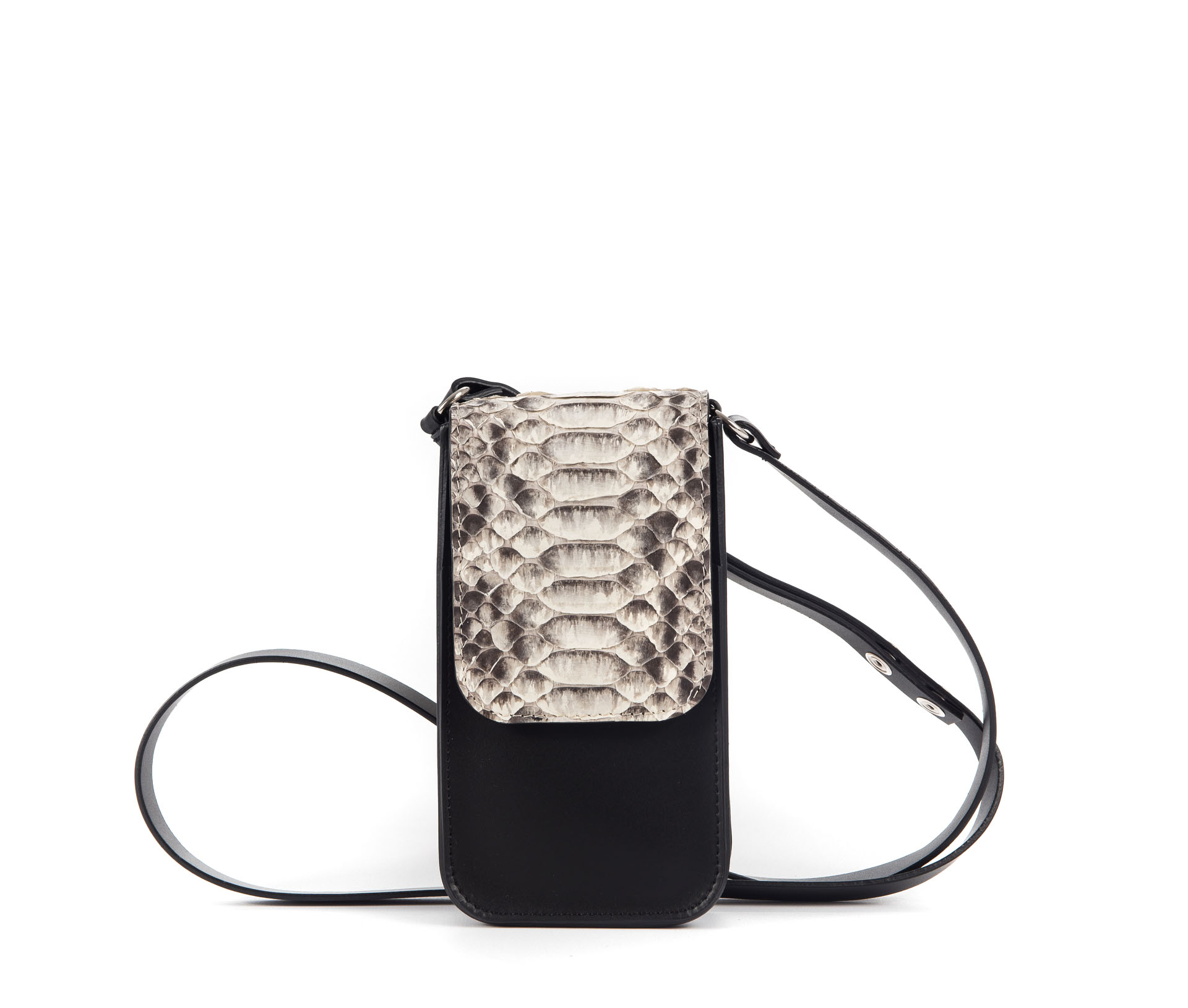 Borsa porta cellulare in cuoio nero e patta in pelle di pitone colore roccia.
