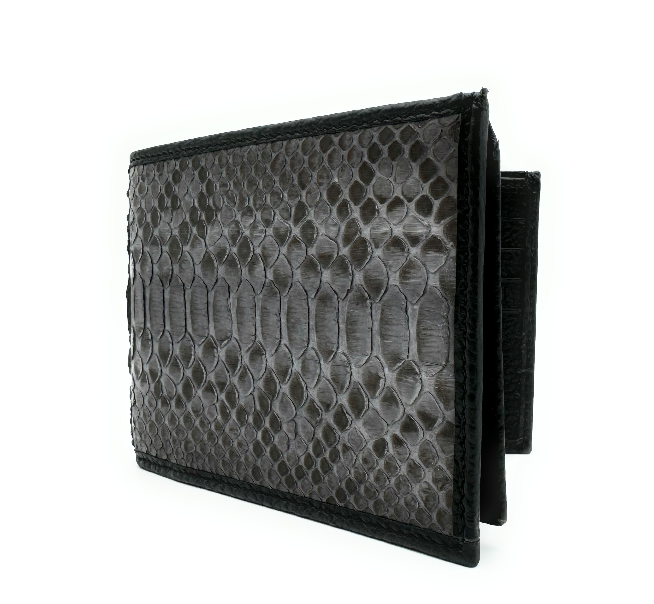 Portafoglio da uomo, formato a libro, realizzato in vero pitone colore grigio e bordato attorno con pelle nera.