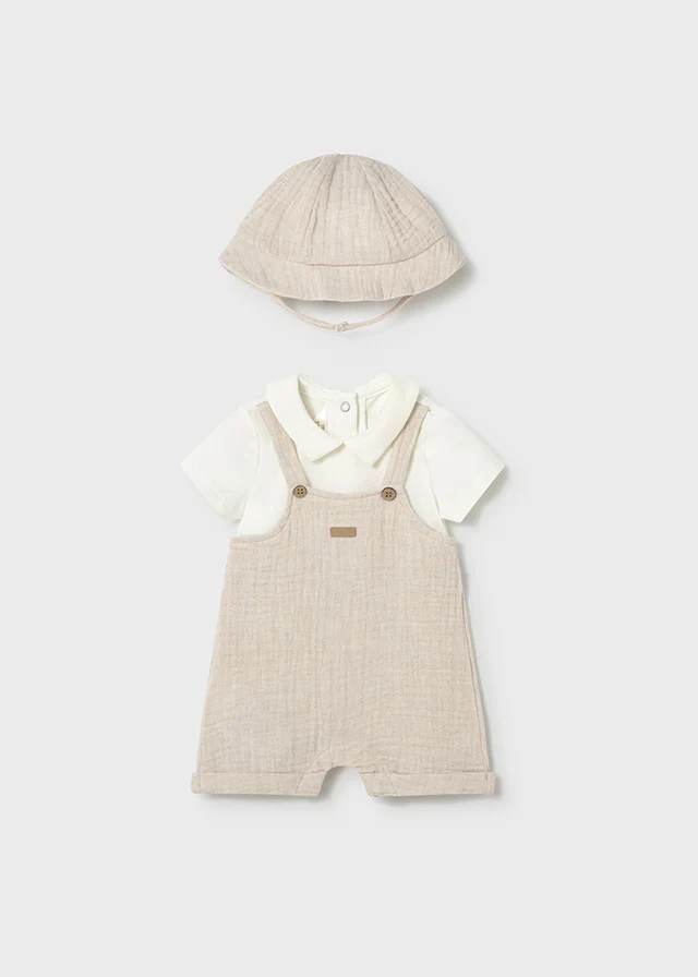 Salopette corta con cappello coordinato Mayoral per neonato. Questo completo due pezzi combina praticitร e stile con una salopette in tessuto leggero ideale per le stagioni calde, completata da un cappello abbinato che protegge delicatamente la pelle sensibile del neonato dai raggi solari. Il design semplice e raffinato rispecchia l’estetica premium Mayoral, mentre i materiali naturali garantiscono comfort e traspirabilitร durante tutto il giorno. Perfetto per occasioni casual e momenti all’aperto, questo set rappresenta la scelta consapevole di chi ricerca qualitร costruttiva e versatilitร nel guardaroba del proprio bambino. Art. 1651-023