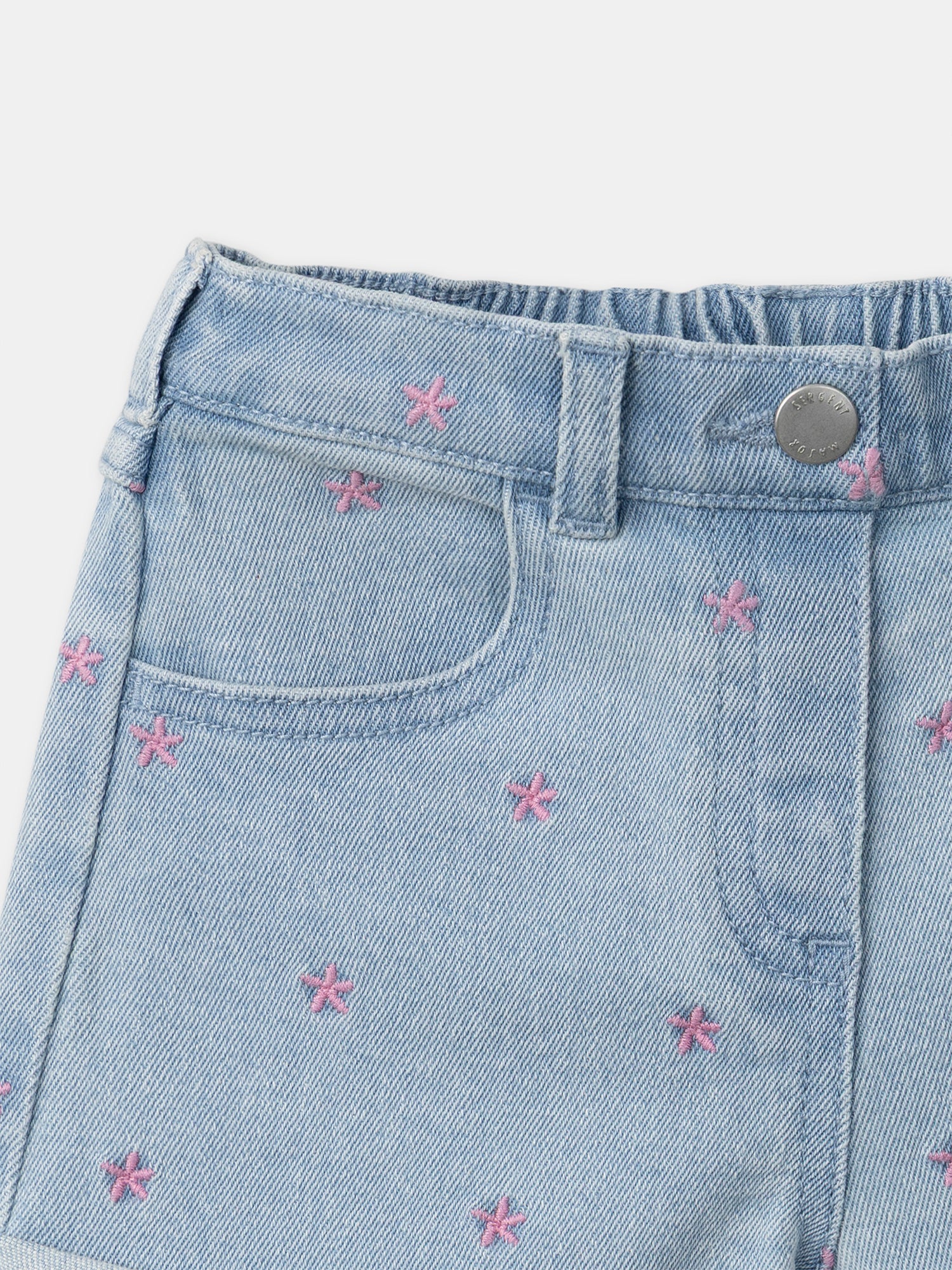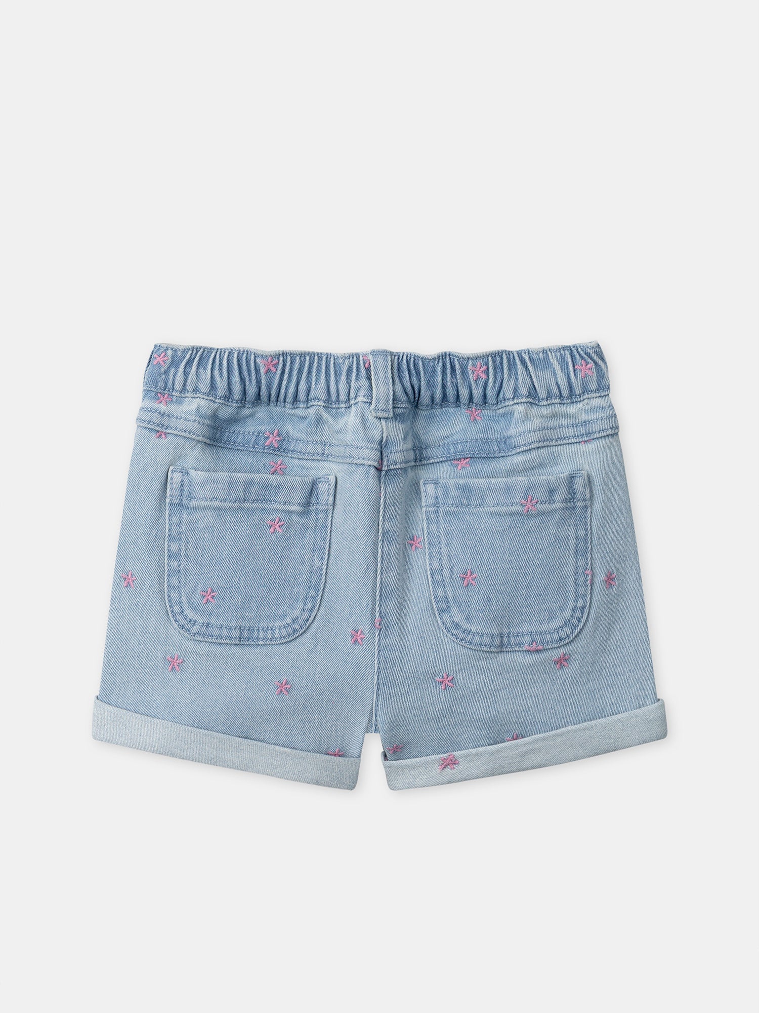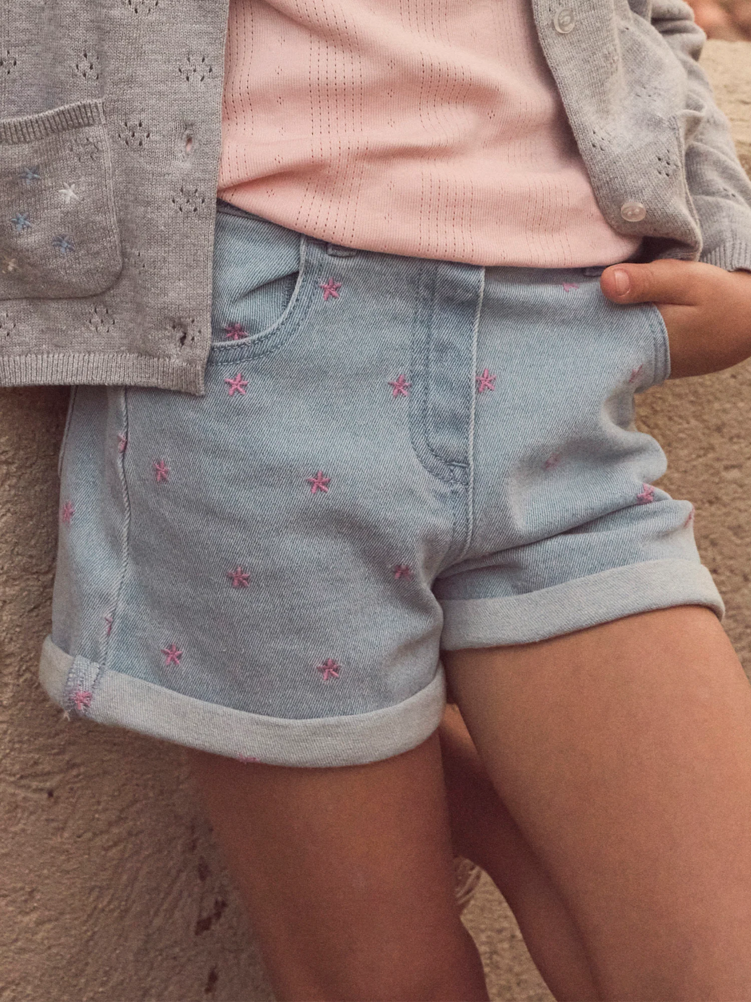 Questi shorts sono pensati per bambini attivi durante l’estate. In denim con vita regolabile, si adattano a tutte le forme del corpo. I ricami floreali rosa aggiungono un tocco estivo.