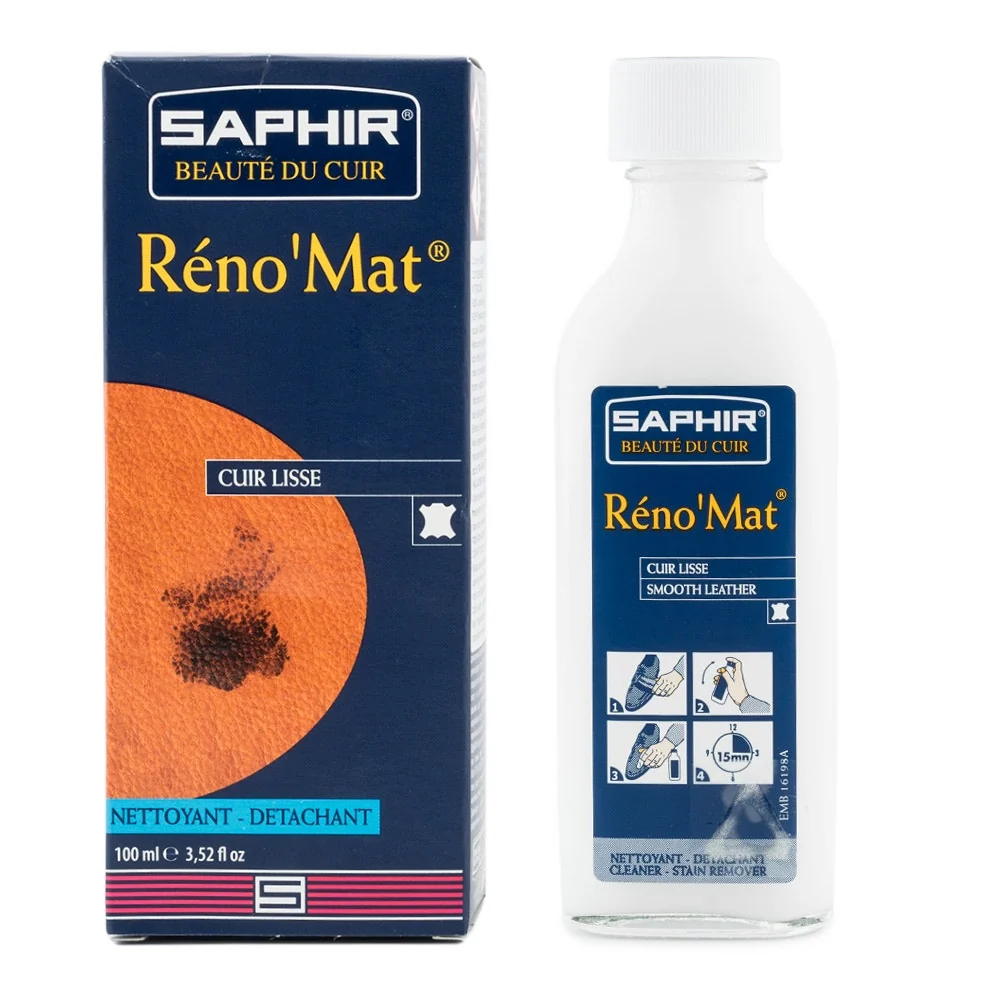 Lo Smacchiatore Saphir Reno’ Mat rimuove le macchie di sporco dalle scarpe in pelle liscia, ideale anche per rimuovere vecchie lucidature e preparate la scarpa ad una nuova lucidatura. Neutro, perfetto per tutti i colori. Utilizzato anche per smacchiare e rinnovare divani in pelle, sedute, capi di abbigliamento e borse. Confezione da 100ml.