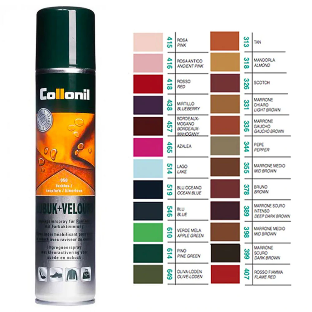 Spray per rinnova il colore di scarpe, stivali, borse ed indumenti in pelle scamosciata. Collonil Nubuck Velours ravvivante del colore ed impermabilizzante (protegge da acqua e sporco) per camoscio e nubuk, il colore neutro è detergente. Confezione da 200ml