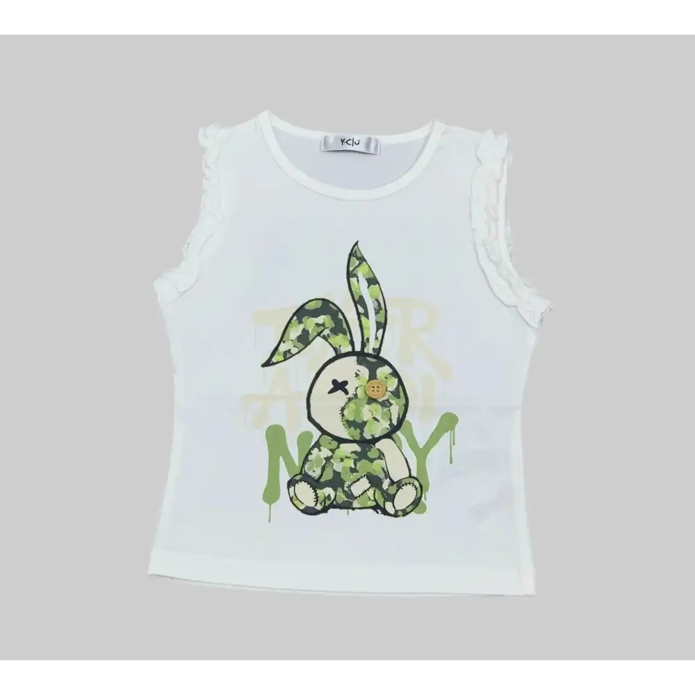 Maglietta bianca in cotone senza maniche con stampa di coniglio verde, ideale per la primavera.