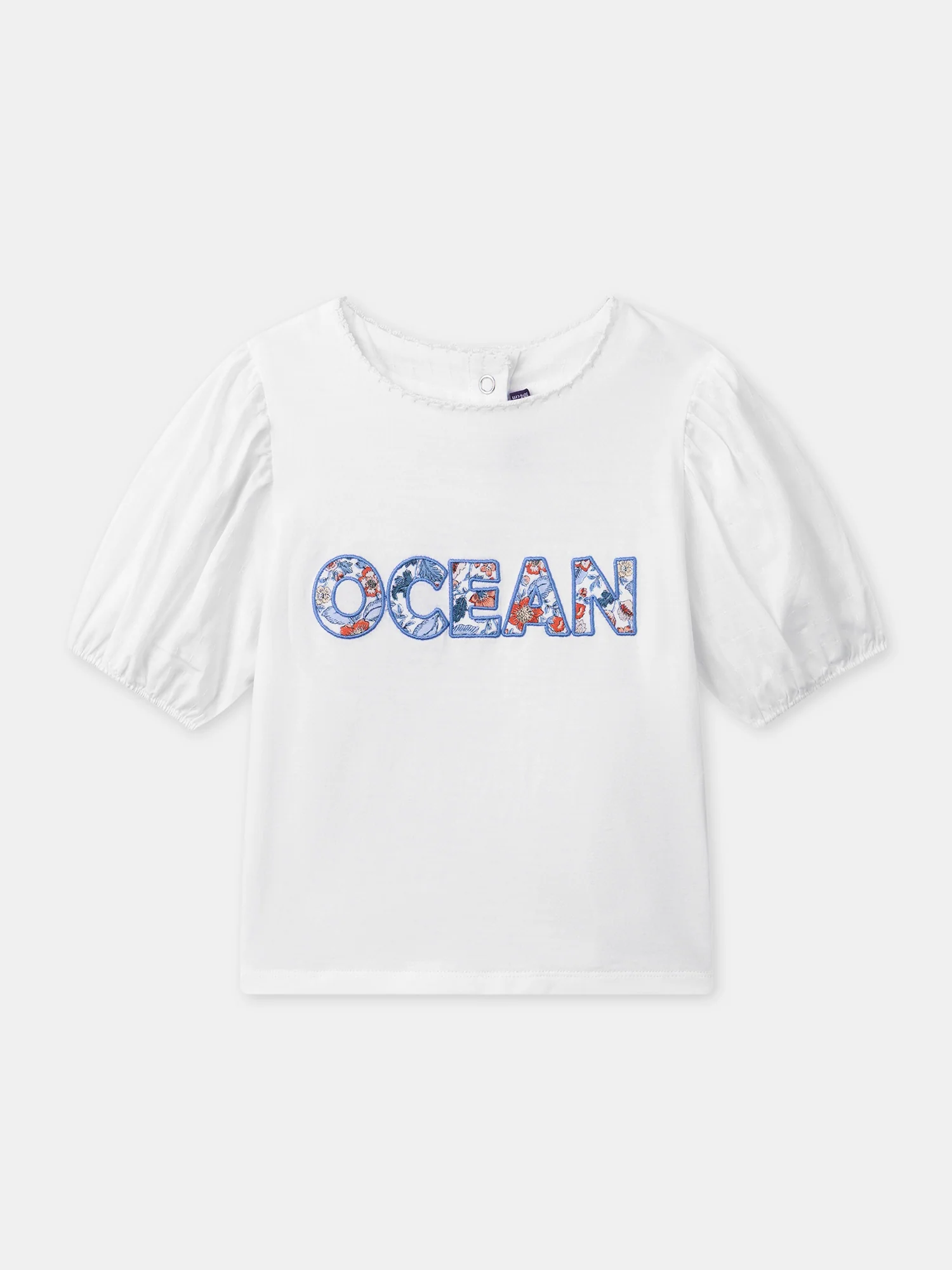 Perfetto per bambini curiosi in primavera ed estate, questa leggera t-shirt assicura comfort. Realizzata in jersey e popeline per un tocco morbido e piacevole. La patch floreale Oceano e le maniche a palloncino aggiungono uno stile marino e una fantasia.