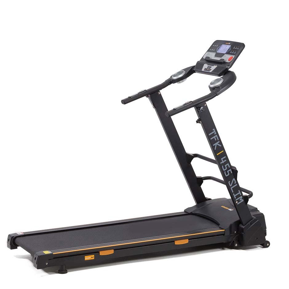 Tapis Roulant Barret TFK-455 SLIM – motore 2/3 HP DC – velocità 0,8-16 km/h inclinazione elettrica – piano di corsa cm 42,5×127 – peso max utilizzatore 110 kg 1 prog. libero, 12 preimpostati, display LCD indicante velocità, frequenza cardiaca (hand pulse), distanza, tempo, consumo calorico, programma in esecuzione