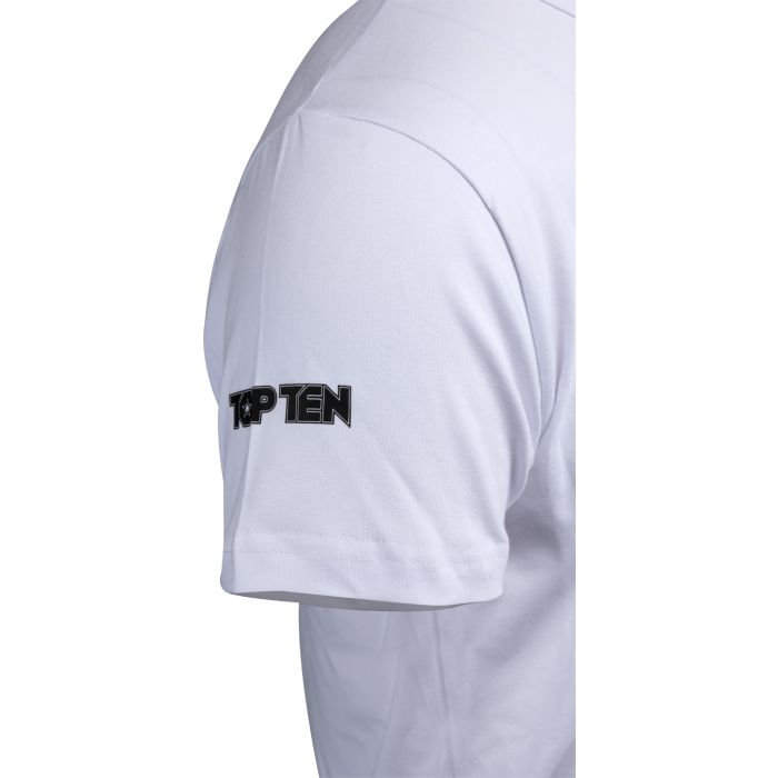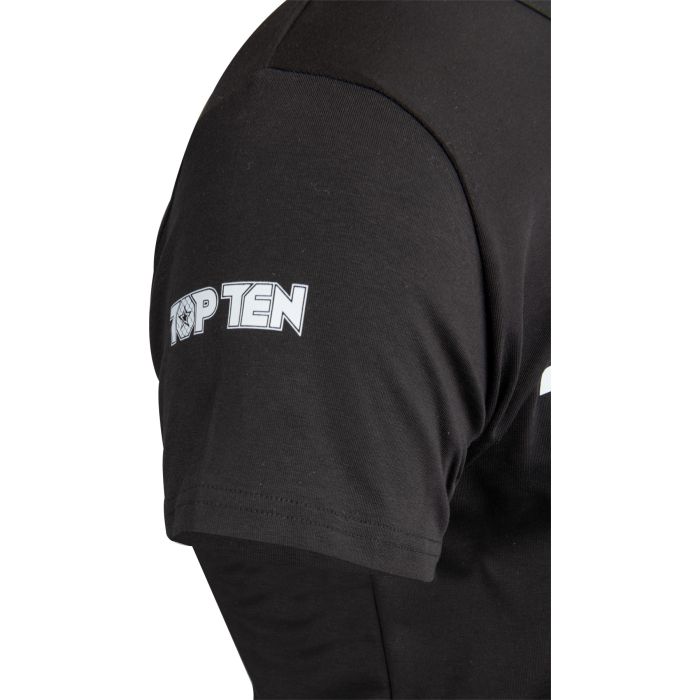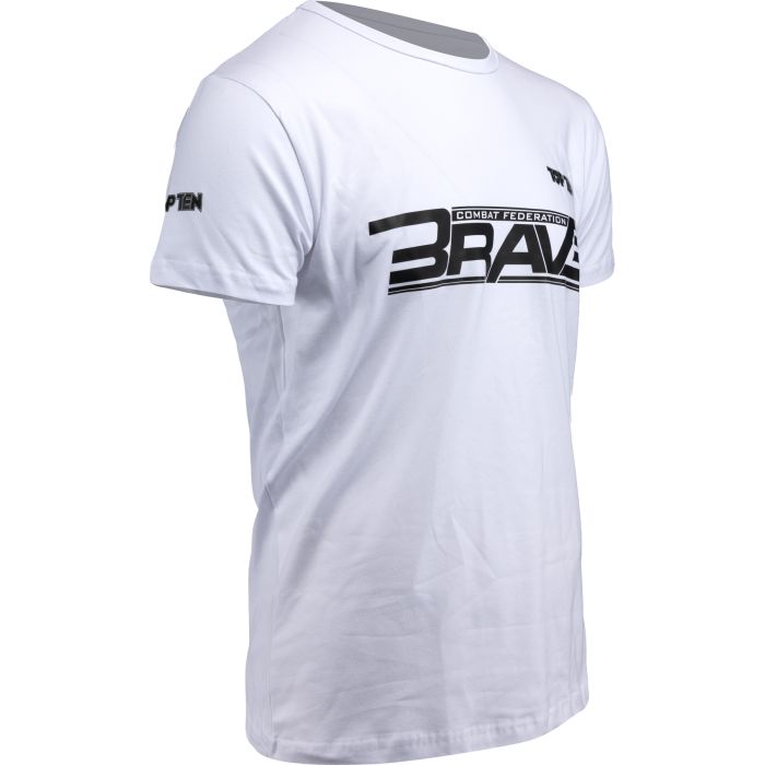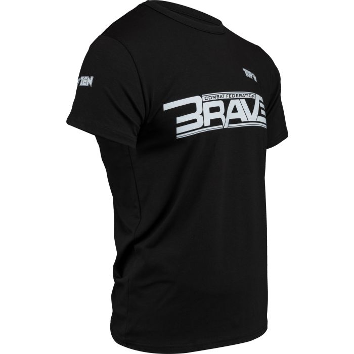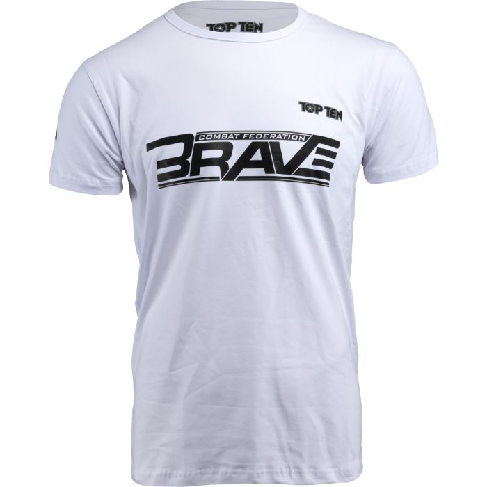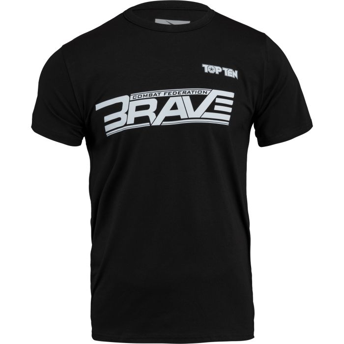 Get business with this T-shirt from the TOP TEN MMA “BRAVE” collection. Made of high-quality cotton, the shirt keeps its shape and falls loose and comfortable. The “BRAVE” print on the chest is visible as an eye-catcher. So your passion for MMA is evident, whether you’re in the Octagon or cheering on your favorites as a spectator. Thanks to the exclusive TOP TEN quality, the “BRAVE” sports shirt impresses in long-term tests and can be easily cleaned in the washing machine for quick freshness and hygiene. Additional advantages: classic T-cut durable cotton fabric Crew neck High-quality “BRAVE” print