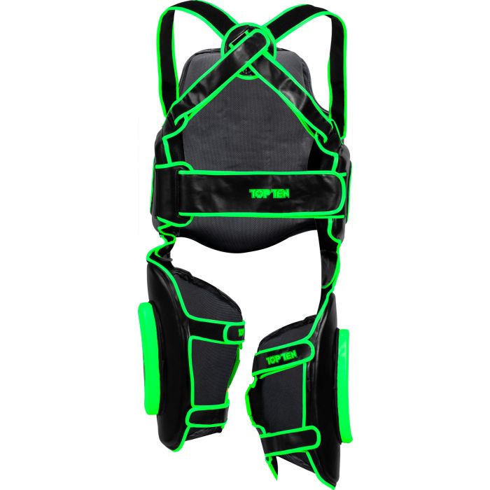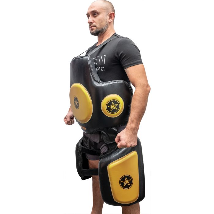 Ben protetto, inizi un nuovo ciclo di allenamenti di arti marziali con il “Bodyguard Xtra”. Lo stomaco, i reni e le cosce sono perfettamente protetti da calci e colpi grazie all’imbottitura protettiva spessa fino a 7 cm. Un sistema di chiusura flessibile con opzioni di regolazione individuali permette di adattare il “Bodyguard Xtra” al rispettivo indossatore. I protettori per le cosce possono essere separati dalla protezione addominale a seconda del focus dell’allenamento. Così, rimani flessibile e riprogetti ogni sessione di allenamento con il set di allenamento “Bodyguard Xtra”. Ulteriori vantaggi: rivestimento in similpelle schiuma multistrato zone di protezione con spessore…