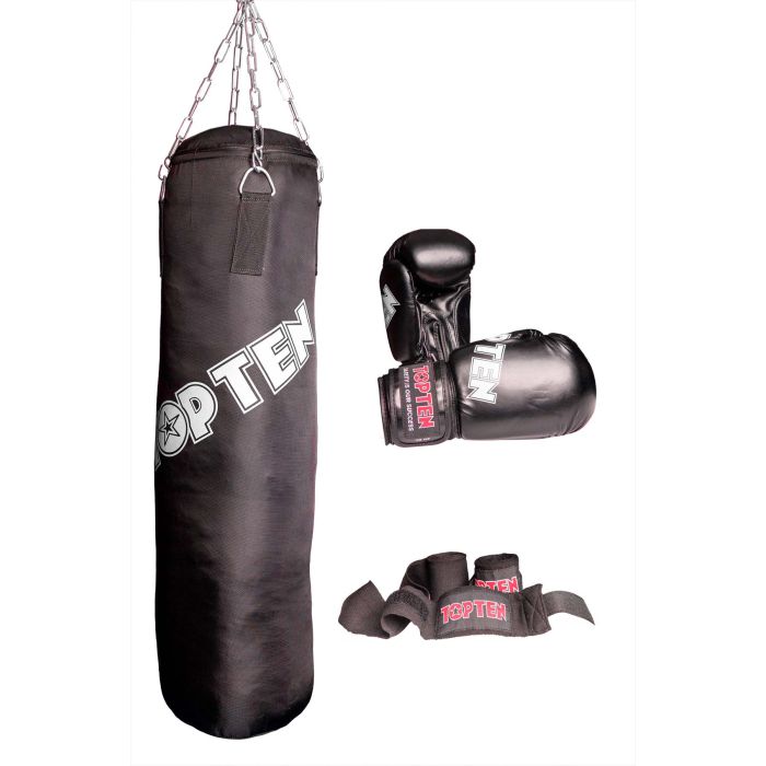 Inizia subito i tuoi allenamenti con il set da boxe TOP TEN “Complete”. In un’unica confezione ricevi un robusto sacco da boxe in tela lungo 100 cm con catena, guantoni da 10 oz in pelle sintetica e fasciature abbinate lunghe 450 cm da indossare sotto. Sia che tu voglia usare il set a casa o che cerchi un’estensione per il tuo studio, con questo set soddisfiamo i requisiti di base per la boxe. Il sacco da boxe può essere semplicemente appeso a una staffa da soffitto o a una stazione da boxe tramite la robusta catena d’acciaio ed è quindi…