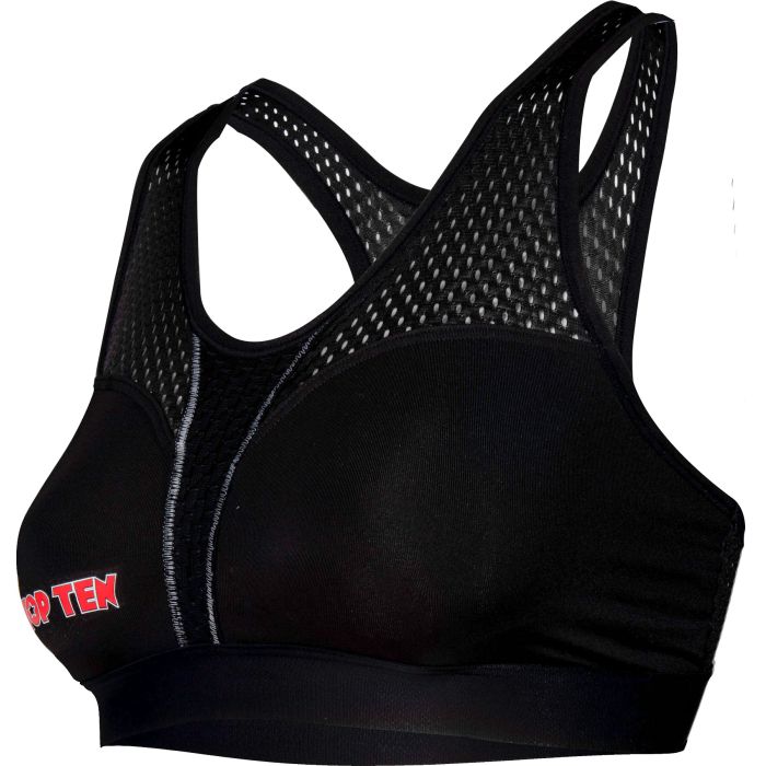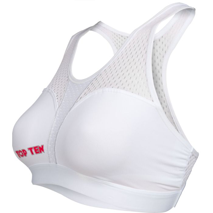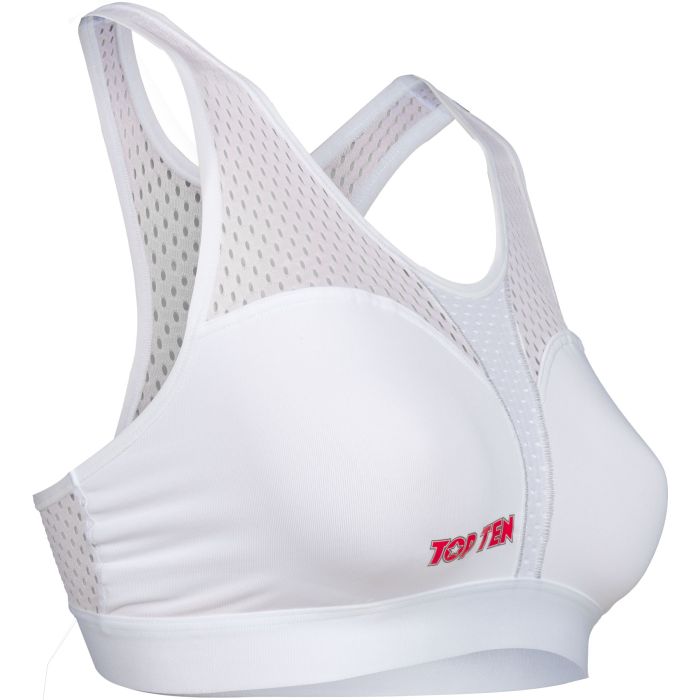 Women and girls start sprinting in martial arts. Increasingly are conquering tatamis and martial arts rings to show their strengths. TOP TEN presents the Sports Bra “Cool Guard” to protect the sensitive breast tissue. It can be worn as a sporty top or pimped into high-quality protective equipment by inserting the unbreakable plastic shells (sold separately). The breathable functional fabric ensures a pleasant feeling on the skin, while the X-Cut on the back reliably holds your chest even under high loads. Thanks to the availability in varied sizes and colors, sports-loving ladies are sure to find their very personal TOP…