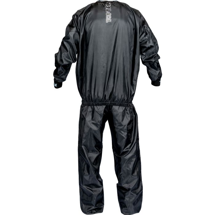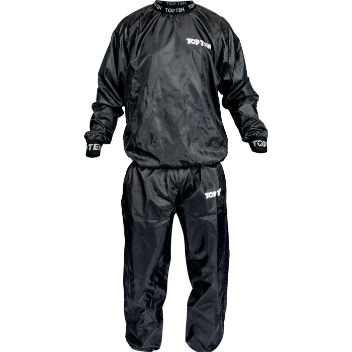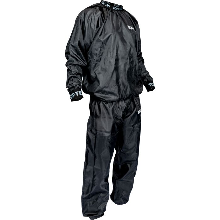 You have your weight precisely under control. With the “Shelter” sweat suit from TOP TEN, you can ensure the correct scale numbers by reducing water loss. Its material, made of sealed polyamide, stores heat close to the body, stimulating sweat production. Tight cuffs on the arms and legs stop the air exchange and ensure the top and jacket fit perfectly. With its simple design, the “Shelter” two-piece suit is a showpiece you can wear when warming up or on easy runs. Additional advantages: practical two-piece suit with a long top + trousers non-slip cuffs sealed nylon material sporty cut easy…