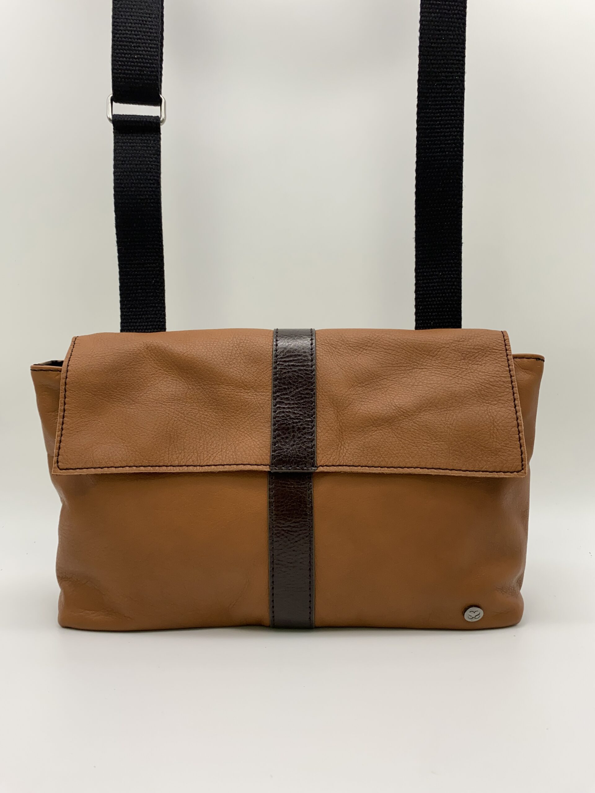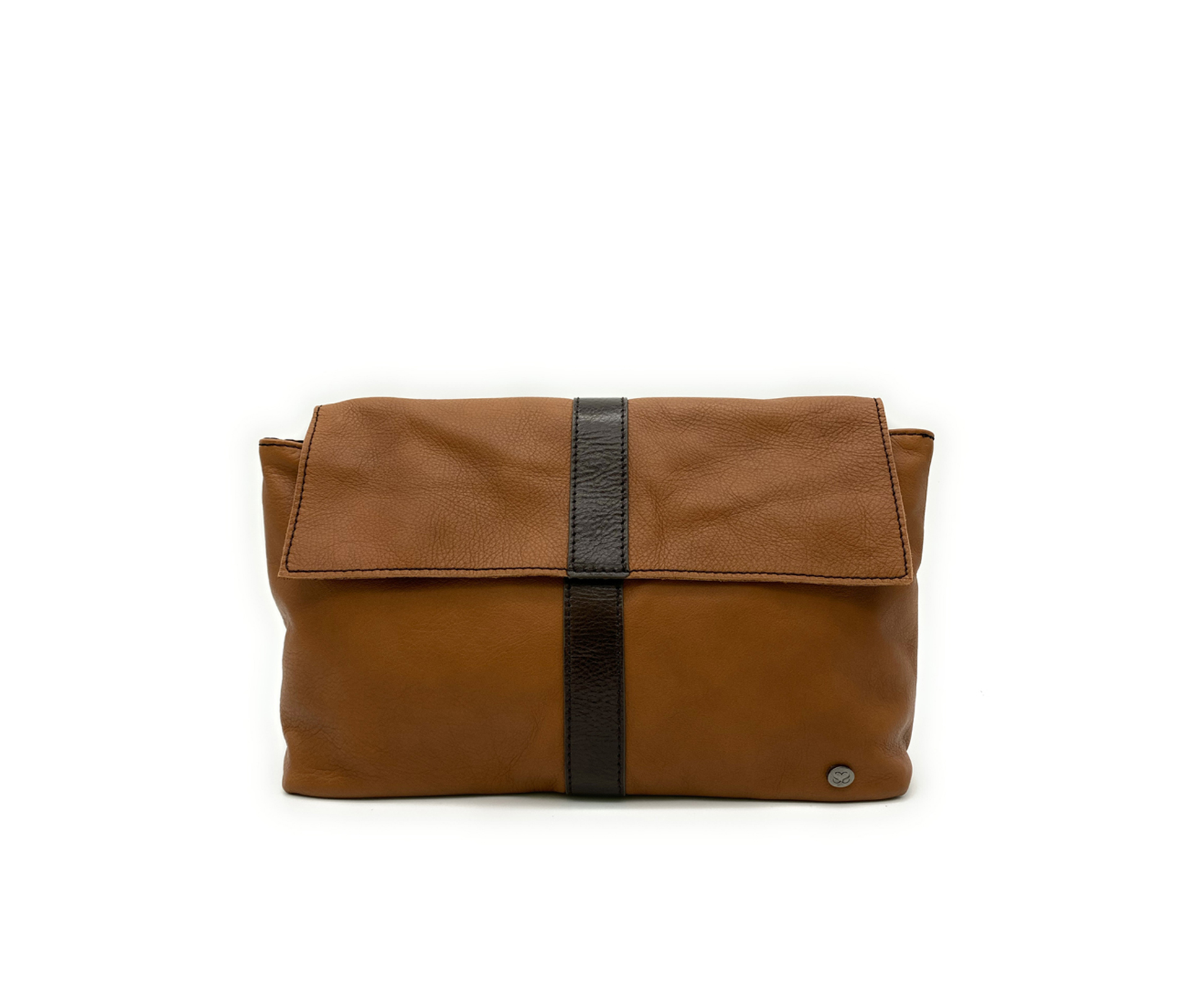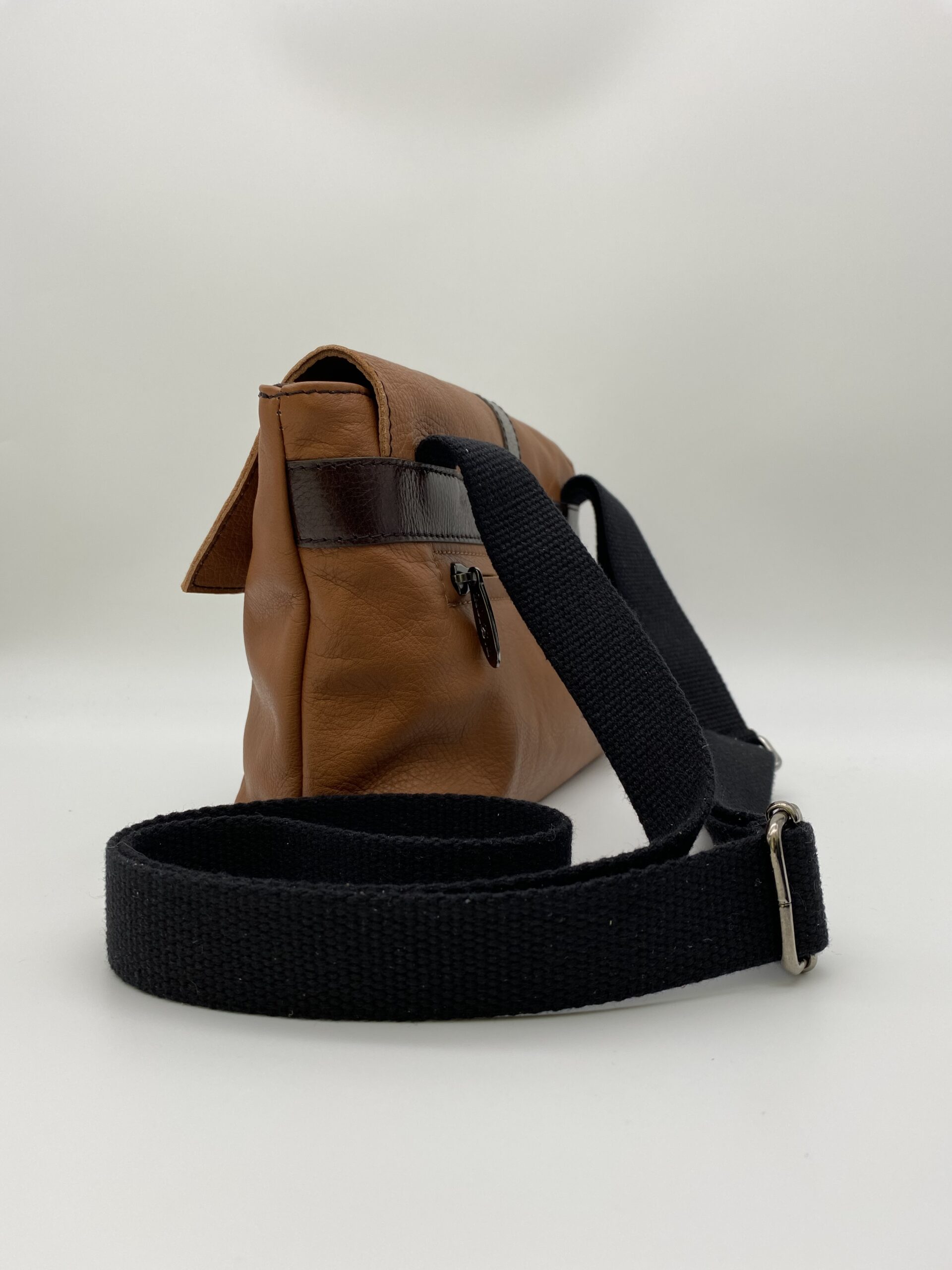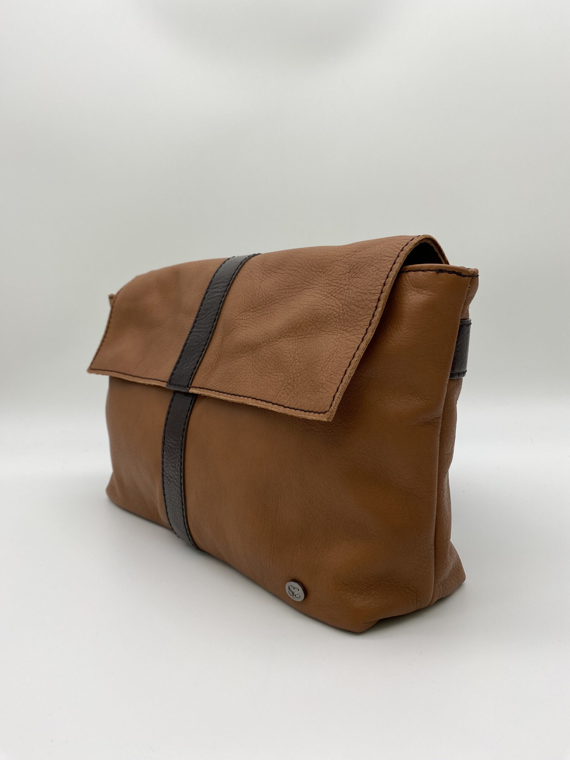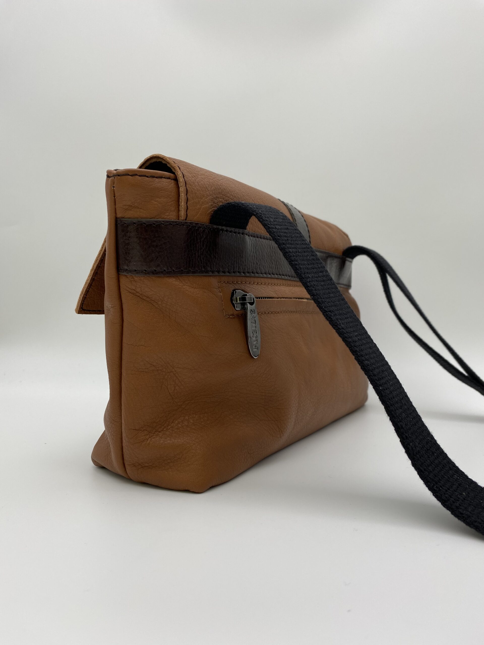 La fascia in cuoio colore testa moro, che percorre tutto il fronte della borsa in senso verticale, conferisce uno stile inconfondibile.