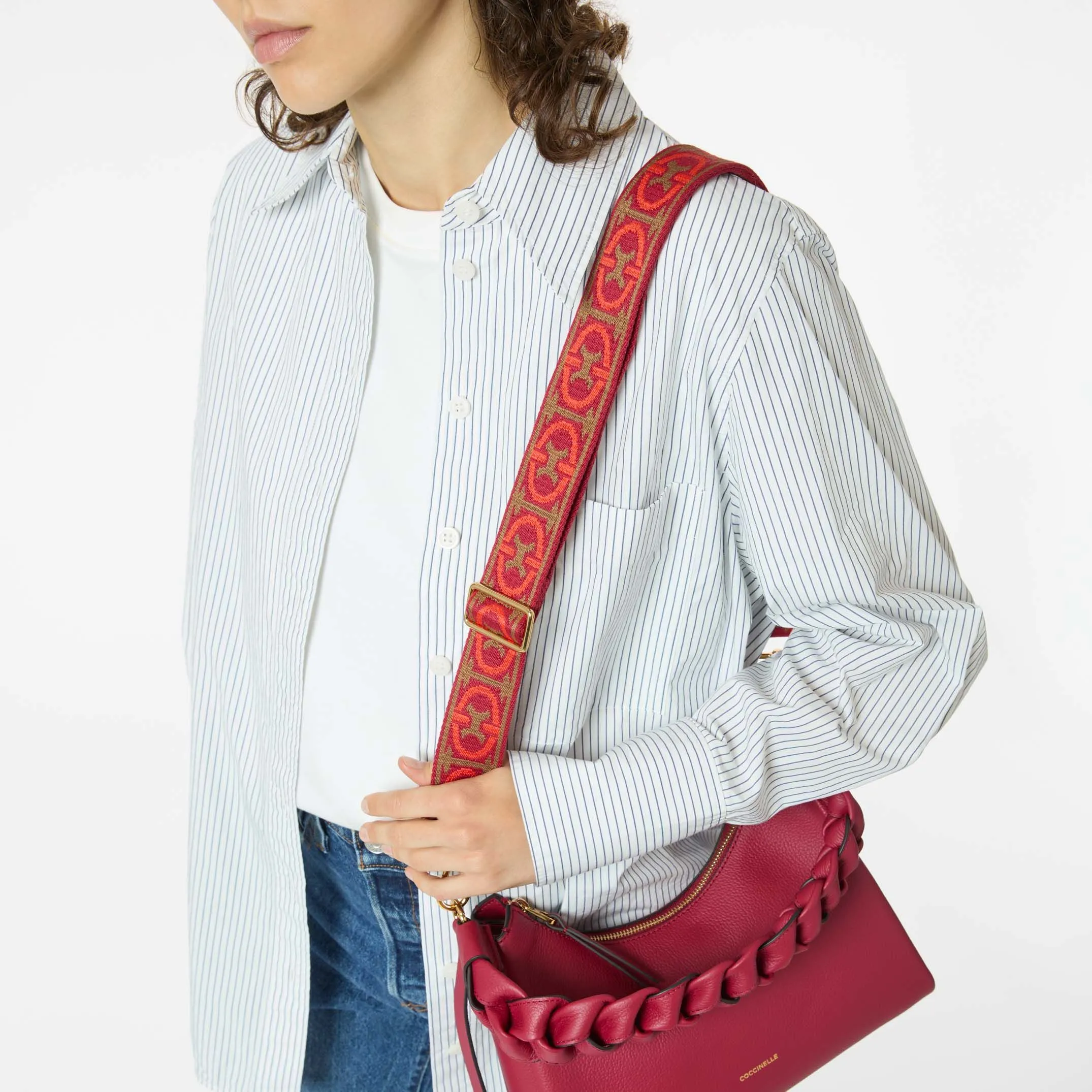 Tracolla in tessuto Jacquard con motivo Monogram Coccinelle. Regolabile con anello scorrevole. Perfetta per personalizzare la propria borsa. Questo modello è realizzato in tessuto 100% cotone. Il tessuto jacquard monogram è realizzato utilizzando un apposito telaio in grado di eseguire disegni complessi. Questo tessuto una volta finito viene lavorato ulteriormente e dotato di soluzione antisfilo sul retro e soluzione antigoccia sulla parte a vista. Pulire con panno di cotone bianco appena inumidito con acqua e lasciare asciugare.