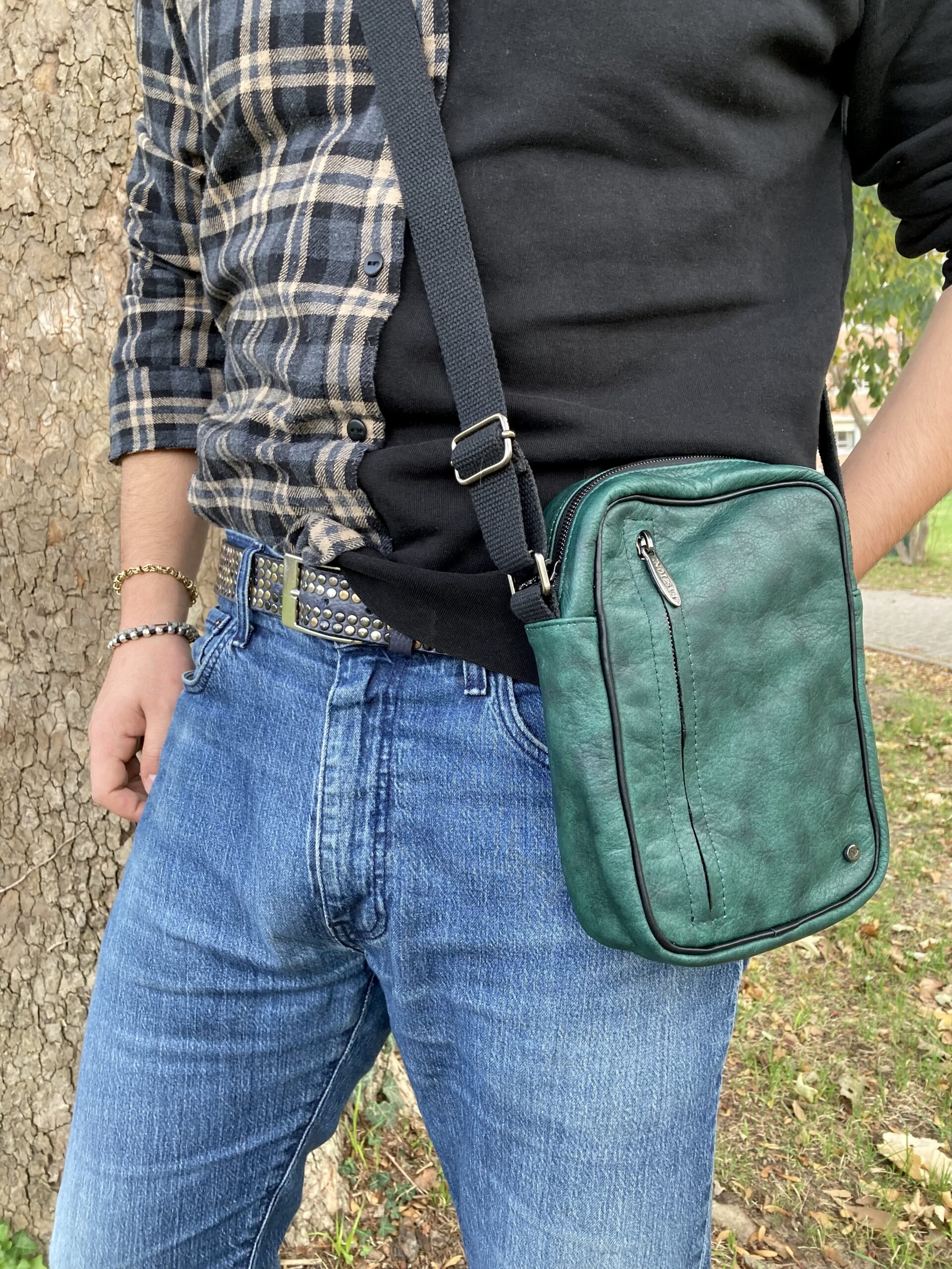 Moderna borsa verticale a tracolla uomo in vera pelle.