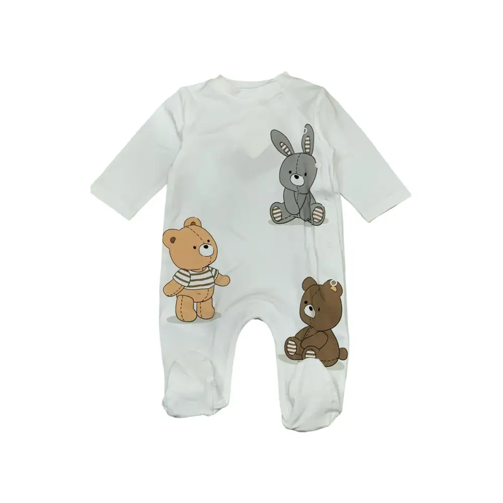 Tutina neonato in cotone bianca con stampa di due orsetti e un coniglio. Apertura frontale comoda, morbida e delicata sulla pelle.