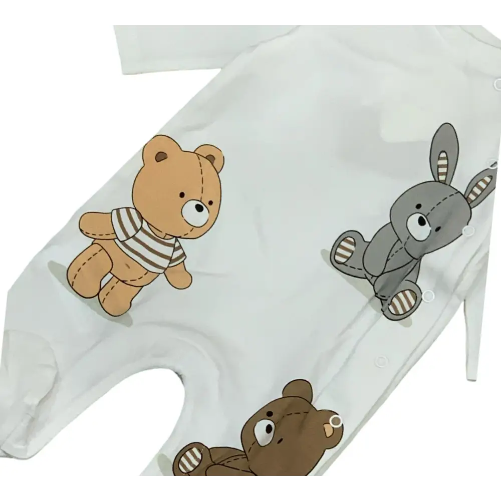 Colore bianco con dolce stampa di due orsetti e un coniglio: un design tenero e accattivante.