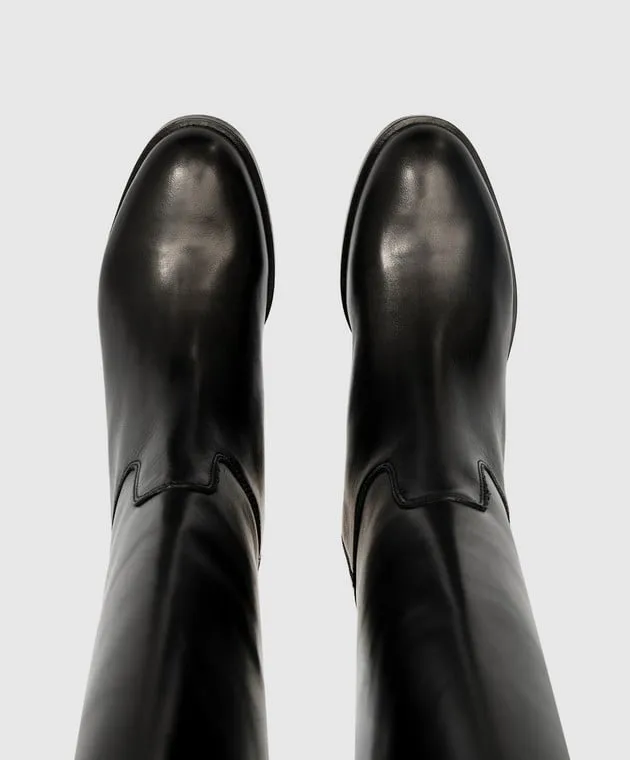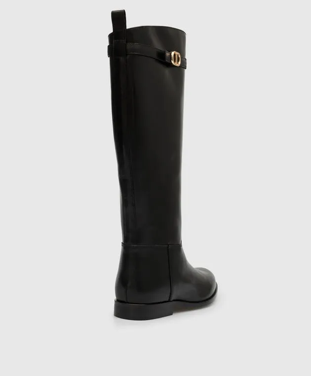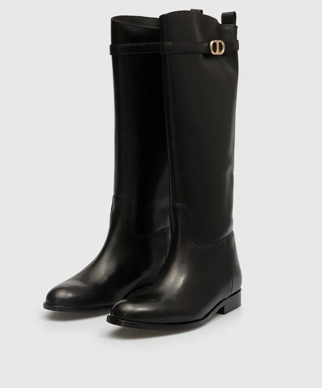 stivale in pelle nera modello cavallerizza. Fibbia con logo Oval T dorato, suola antiscivolo in gomma con tacco alto 2 cm.
