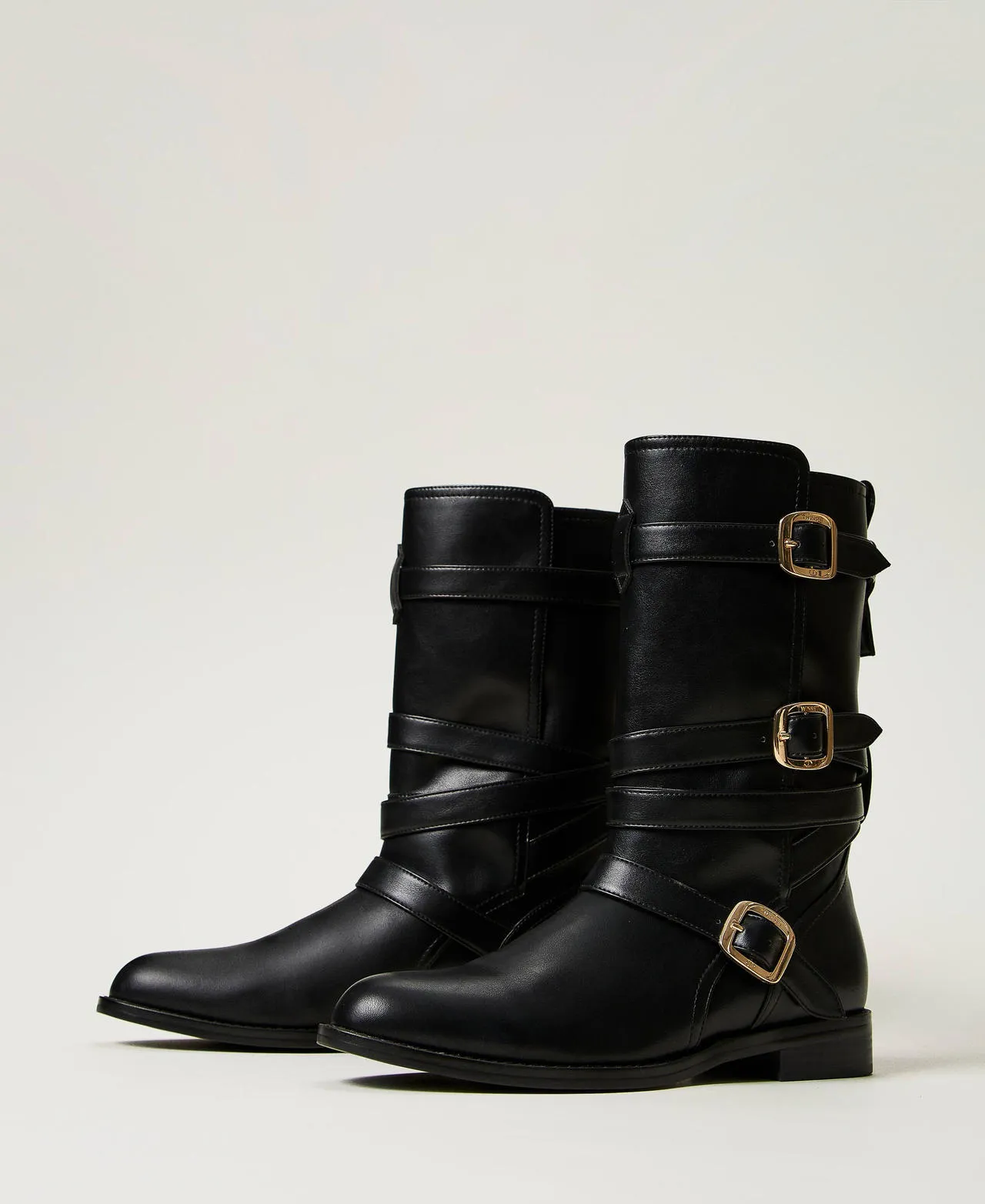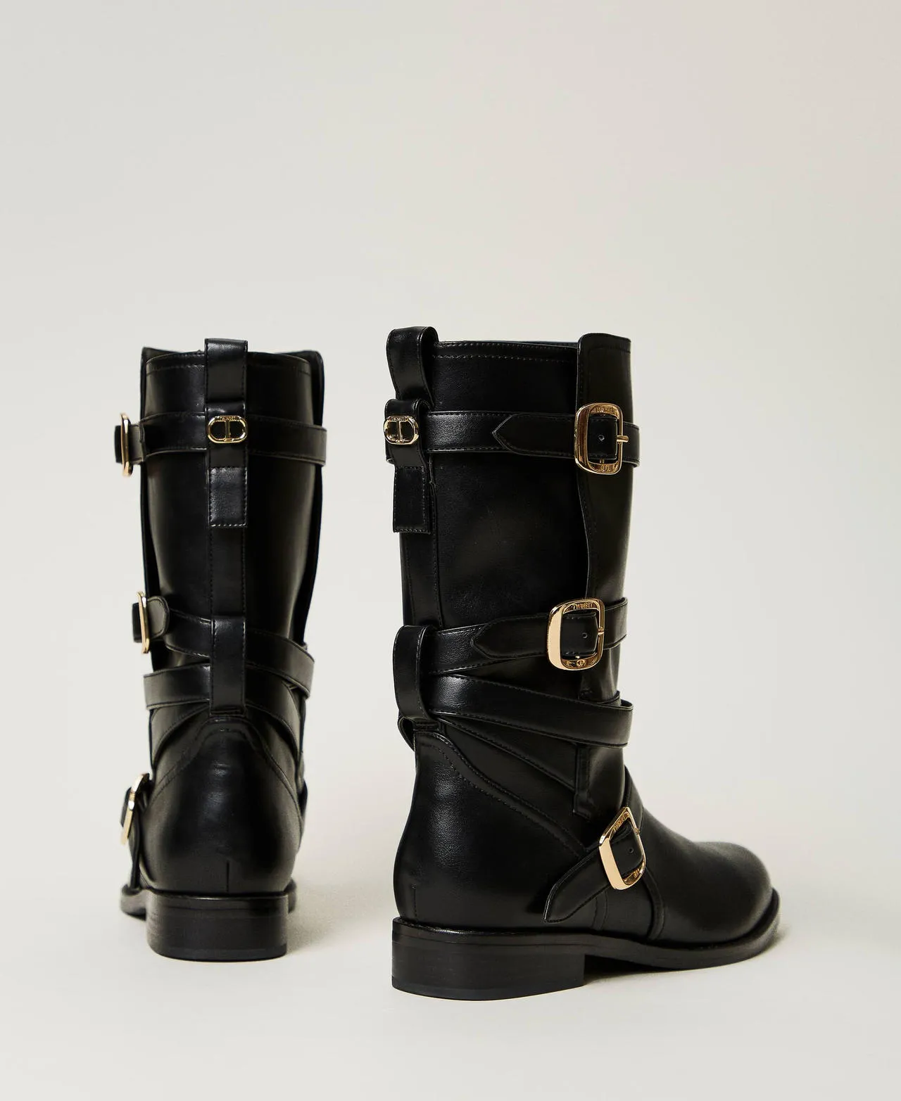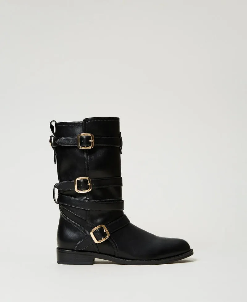 Stivali biker con cinturini e fibbe, tacco a colonna, fondo in gomma.