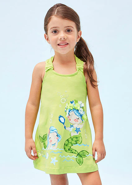 Capo ECOFRIENDS contiene cotone organico. Vestito con bretelle per bambina. Girocollo. Design con apertura sulla schiena. Design stampato.