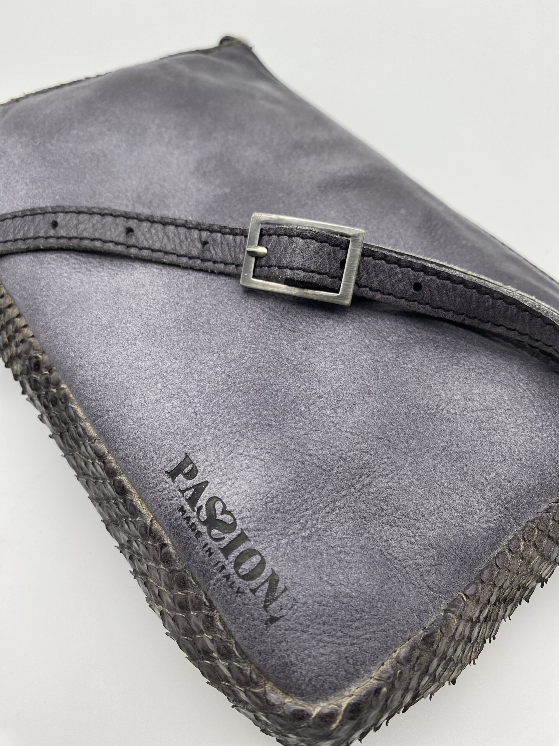 Le squame del pitone sono in rilievo mentre il retro della borsa in pelle liscia con logo Passione.