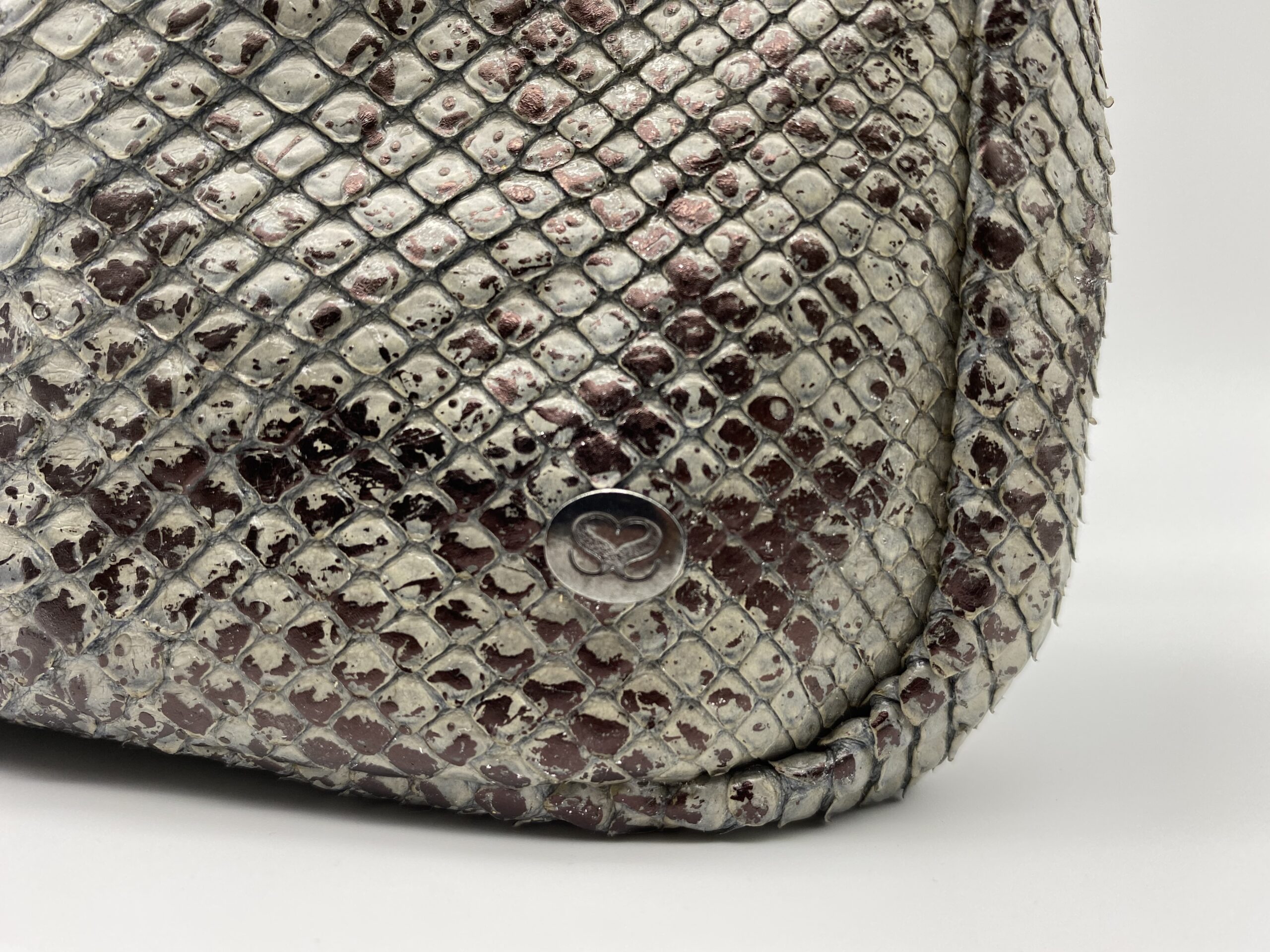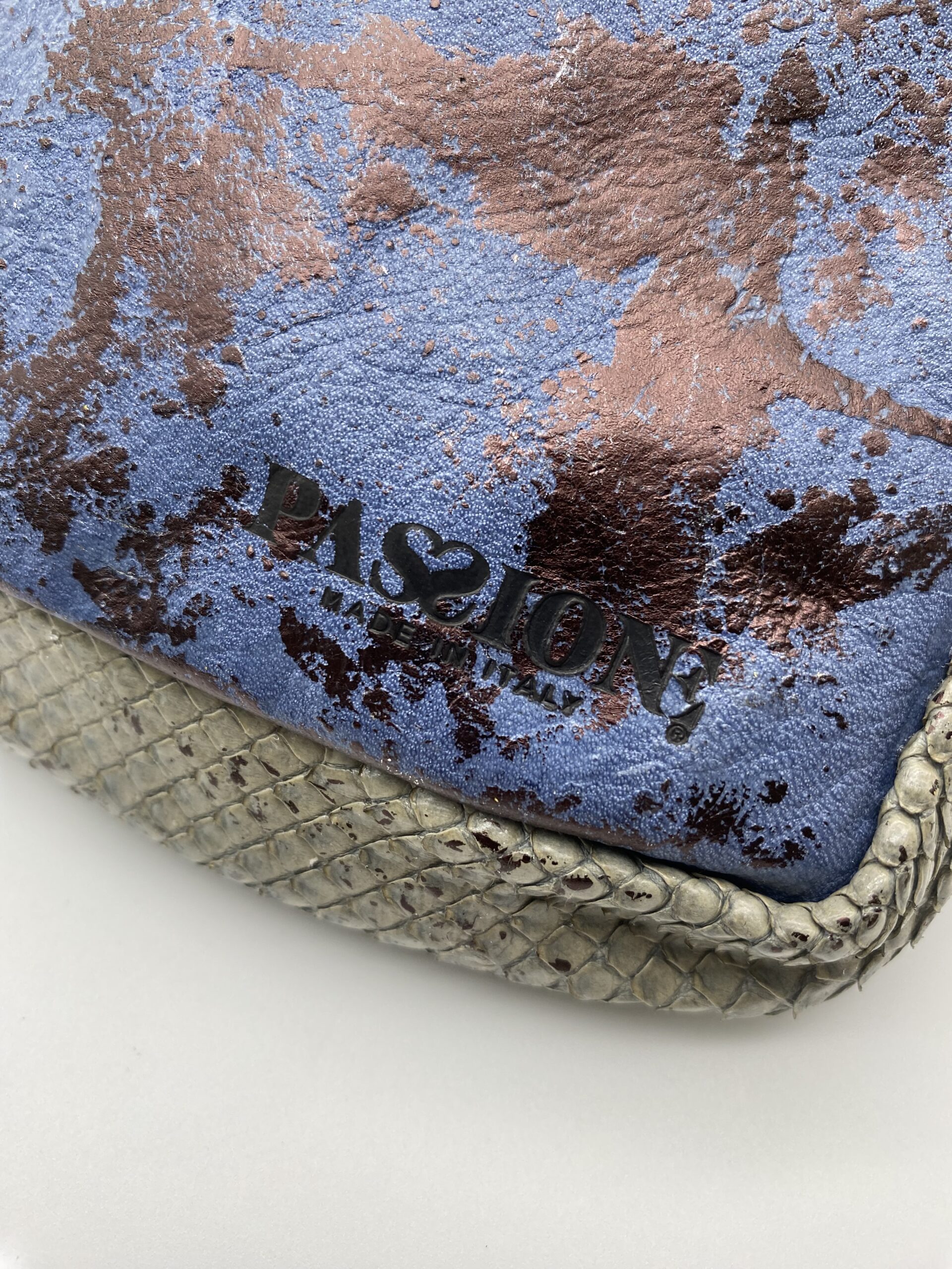 Le squame del pitone sono in rilievo mentre il retro della borsa in pelle liscia con logo Passione.