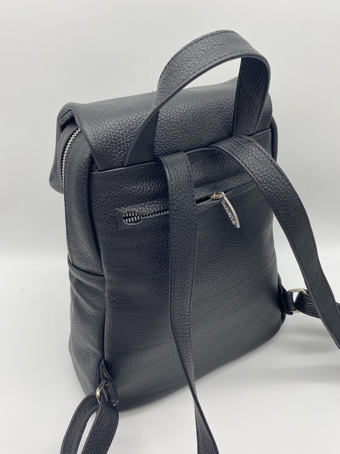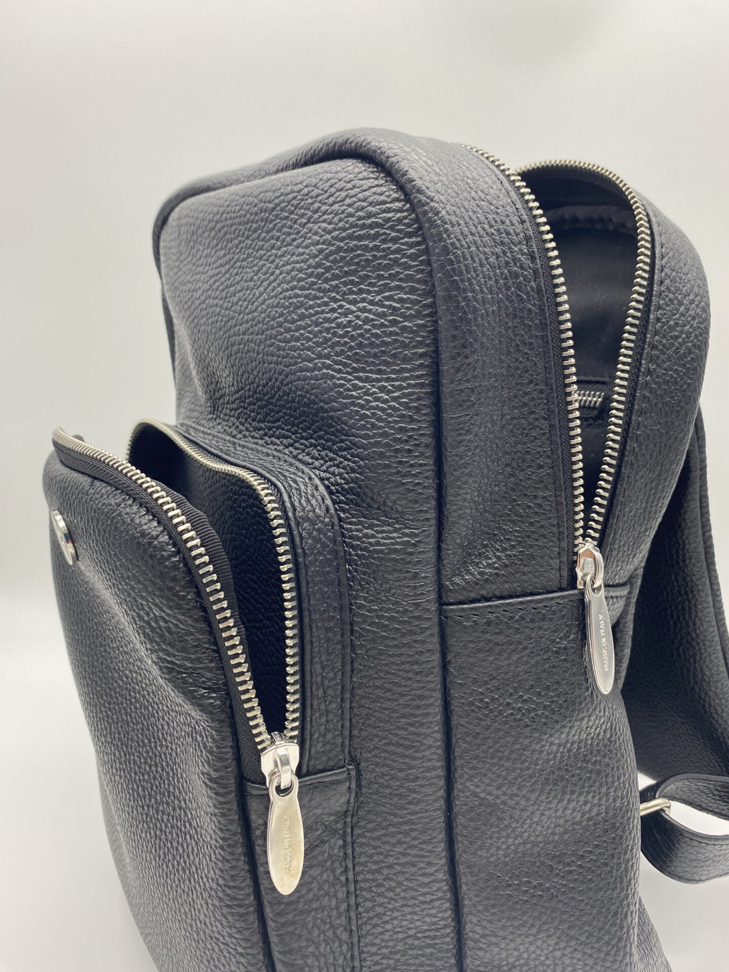 Zaino in vera pelle con scomparti zip.