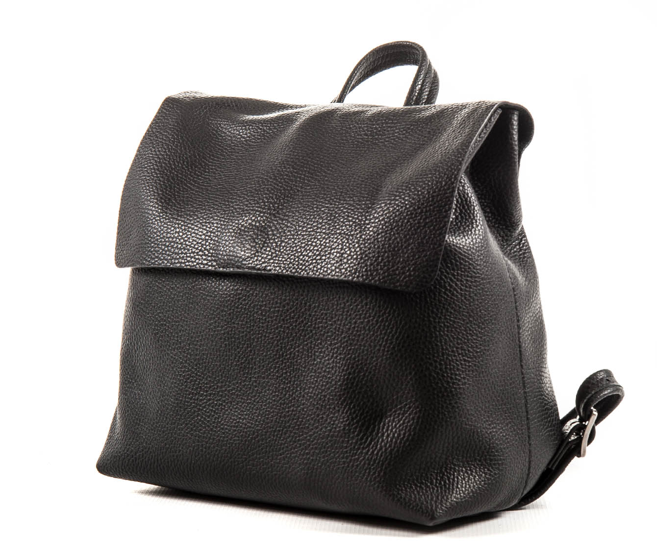 Zaino in pelle di vitello color nero sfoderato, dotato di manico e di due bretelle regolabili tramite le fibbie.